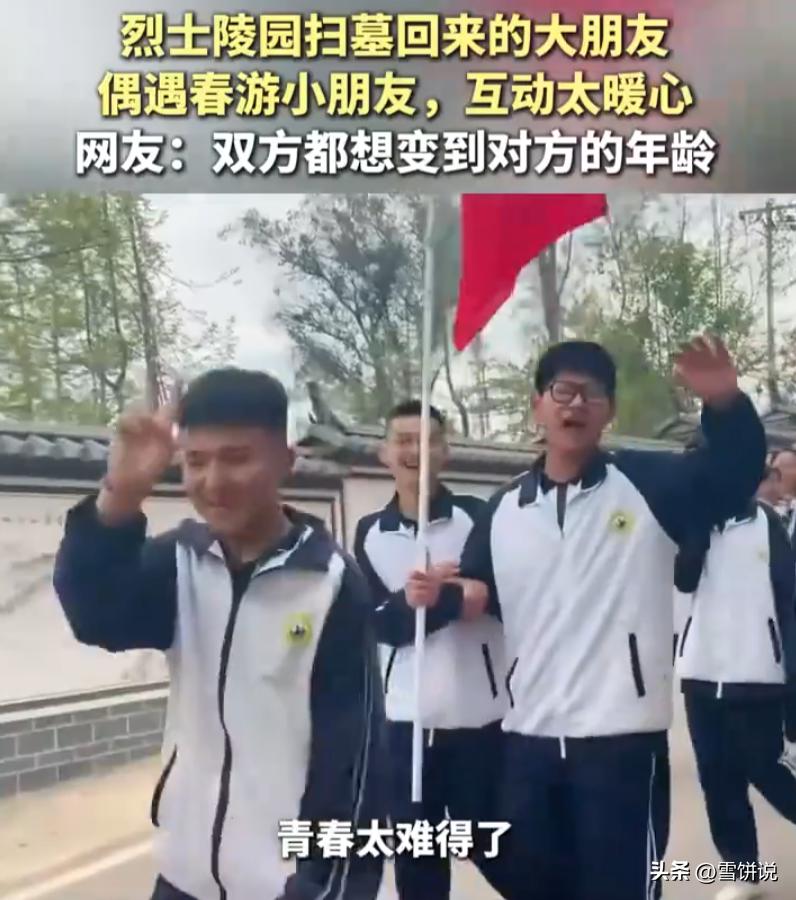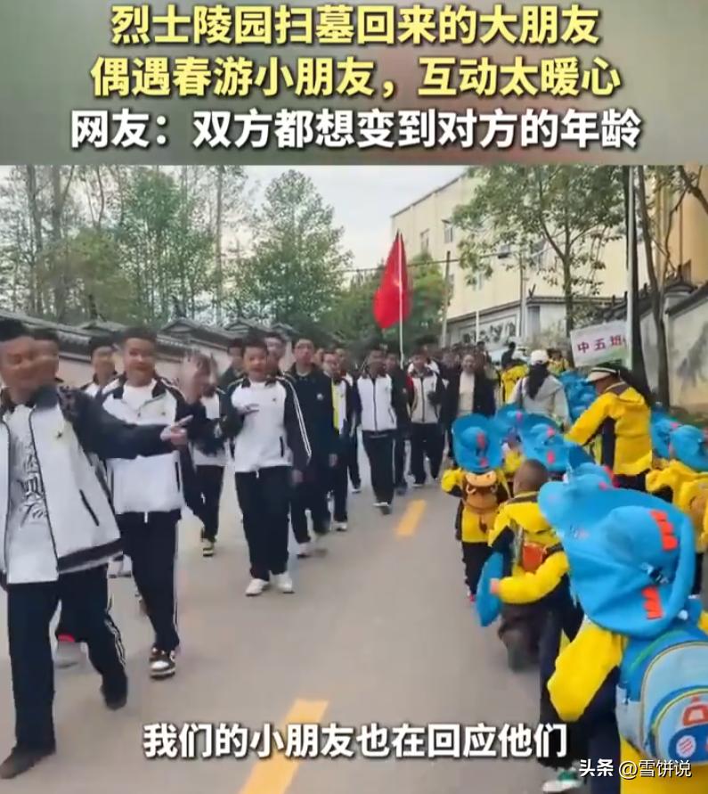 这个画面太美好了!云南永平,一幼儿园组织孩子们去春游,结果路上刚好遇到了从烈士陵园扫墓回来的大哥哥大姐姐们,双方的互动相当暖心,网友:两边都想变到对方的年龄 画面中,一边是幼儿园的小不点们,背着花花绿绿的小书包,蹦蹦跳跳去春游。另一边是刚从烈士陵园扫墓回来的大哥哥大姐姐,步伐沉稳,神情庄重还没完全散去 两拨人就这么在路上碰上了 没有谁安排,也没有谁指挥。大孩子们看到这群小豆丁,脸上的表情瞬间就松了,笑着挥手打招呼。小孩子们呢,也不认生,奶声奶气地喊哥哥姐姐好,有的还伸出小手比个耶 带队老师王女士用手机拍下了这一幕。她说当时就觉得这个画面特别美好,两个年龄段的孩子,用各自最自然的方式打了个照面 不得不说,看到这一幕真的会让人感慨万千 大孩子们刚从烈士陵园出来,心里装的是历史、责任、缅怀,转头看见这群无忧无虑的小家伙,大概会想起十几年前的自己,那时候天不怕地不怕,最大的烦恼是午饭有没有鸡腿 而小孩子们呢,正眼巴巴盼着快点长大,觉得大哥哥大姐姐好酷,能自己去春游,不用老师牵着排队走 人好像永远都在羡慕自己没有的那个阶段 小的想变大,大的想变小。上学的想上班,上班的想回学校。单身的想成家,成家的怀念一个人的自由