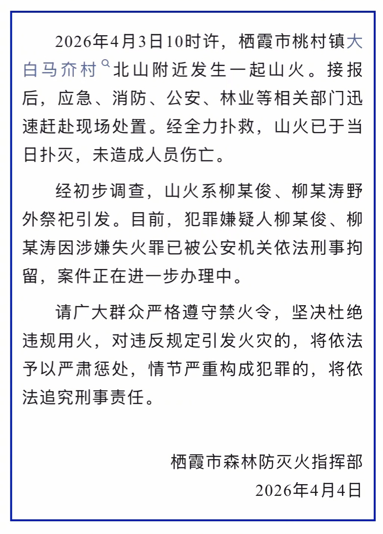 据披露,3日10时许,栖霞市桃村镇大白马夼村北山附近发生一起山火。接报后,应急、消防、公安、林业等相关部门迅速赶赴现场处置。经全力扑救,山火已于当日扑灭,未造成人员伤亡。经初步调查,山火系柳某俊、柳某涛野外祭祀引发。目前,犯罪嫌疑人柳某俊、柳某涛因涉嫌失火罪,已被公安机关依法刑事拘留,案件正在进一步办理中。