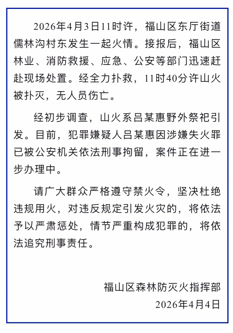 3日11时许,福山区东厅街道儒林沟村东发生一起火情。接报后,福山区林业、消防救援、应急、公安等部门赶赴现场处置。经全力扑救,当天11时40分许山火被扑灭,无人员伤亡。经初步调查,山火系吕某惠野外祭祀引发。目前,犯罪嫌疑人吕某惠因涉嫌失火罪已被公安机关依法刑事拘留,案件正在进一步办理中。南都N视频记者 周敏萱