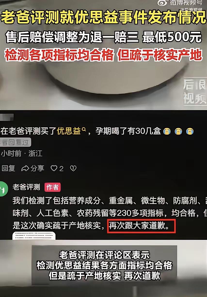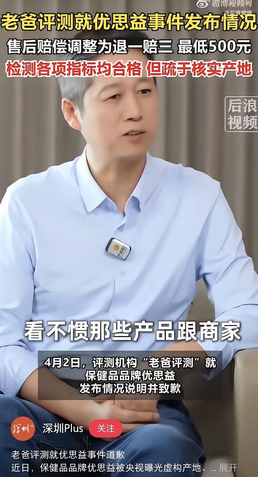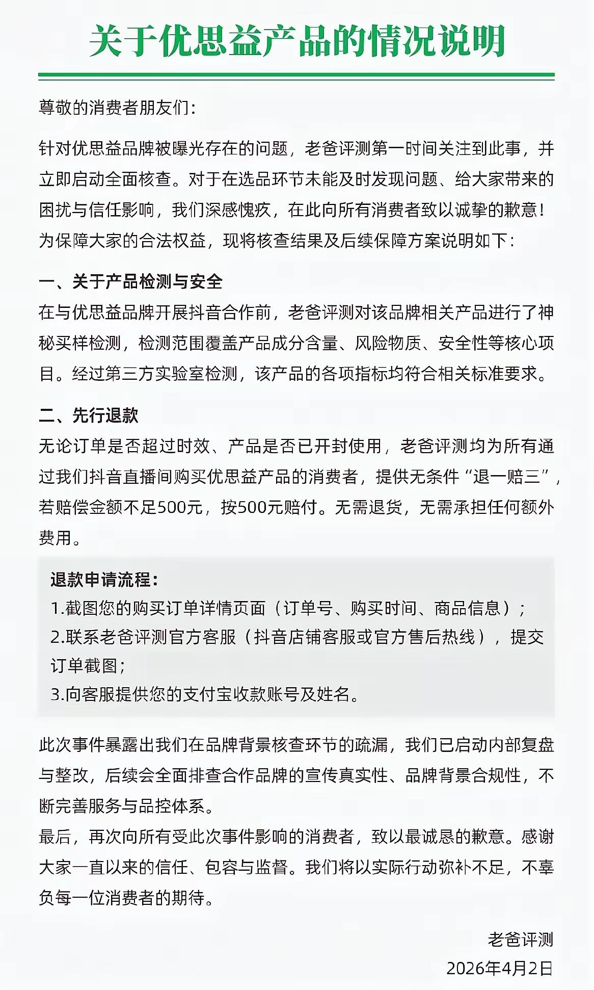 从2024年到2026年,老爸评测以 “专业测评推荐”的名义在直播间带货优思益,事情发酵后,老爸评测倒是比董宇辉更早站出来。在赔偿这件事上,老爸评测比董宇辉的“全额退款”更让消费者满意,不过是因为他带货优思益的收益少。