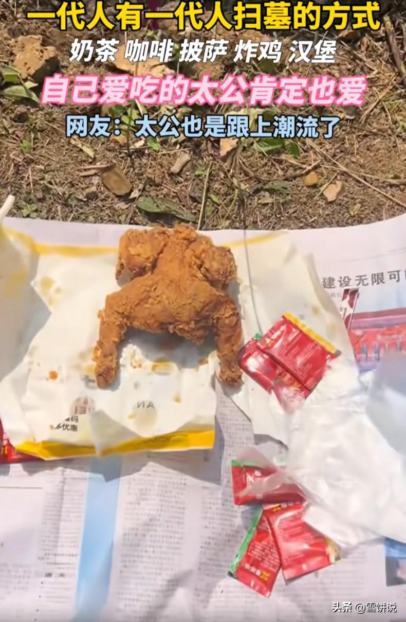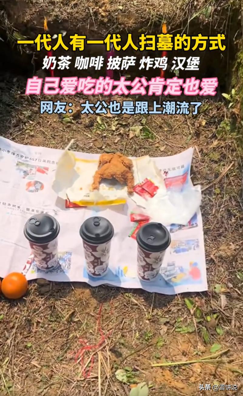 笑不活了!一位00后男生清明节去扫墓,但这次他并没有带一些常见的贡品,而是拿上炸鸡、奶茶这些自己平时爱吃的东西,在他看来:自己爱吃的东西,太公肯定也爱!网友:主要是自己能吃 按老一辈的做法,这时候应该拎上白酒、烧鸡、水果、纸钱,规规矩矩摆好,磕三个头,烧一把纸,说几句保佑全家平安的话。但这位小伙子不一样 他带了什么?三杯奶茶、一份完整的炸鸡、两个橘子。炸鸡旁边还贴心放了一次性手套。到了坟前,先上三炷香,然后铺一张报纸,把吃的喝的整整齐齐摆好 有网友调侃:以前是别人拜什么跟着拜什么,现在是自己爱吃什么就拜什么 说起来,老一辈扫墓,带的供品往往是自己舍不得吃的好东西,比如一瓶好酒、一只烧鸡、几样精致的点心。那是那个年代的最高礼遇——我把最好的留给先人 但现在这些年轻人不一样了。炸鸡奶茶是他们日常生活里最熟悉、最亲切的东西,不是刻意准备的排场,就是随手能买到的快乐。他把自己觉得最舒服的体验分享给太公,这不是不尊重,反而是另一种真诚 有人可能会说,这样是不是太随便了,扫墓总得有点仪式感 但仪式感的本质是什么?是走心,不是走形式。老一辈用烧鸡白酒表达思念,年轻人用炸鸡奶茶表达思念,核心没变,变的只是载体。就像以前写信是表达爱,现在发微信也是表达爱,你不能说发微信就不真诚了 再说了,炸鸡奶茶拜完了,自己吃掉,不浪费粮食。以前有些供品摆完了就扔了,那才叫可惜。太公要是在天有灵,估计也不乐意看后人糟蹋东西 所以这事看着好笑,其实挺暖的 雪饼说
