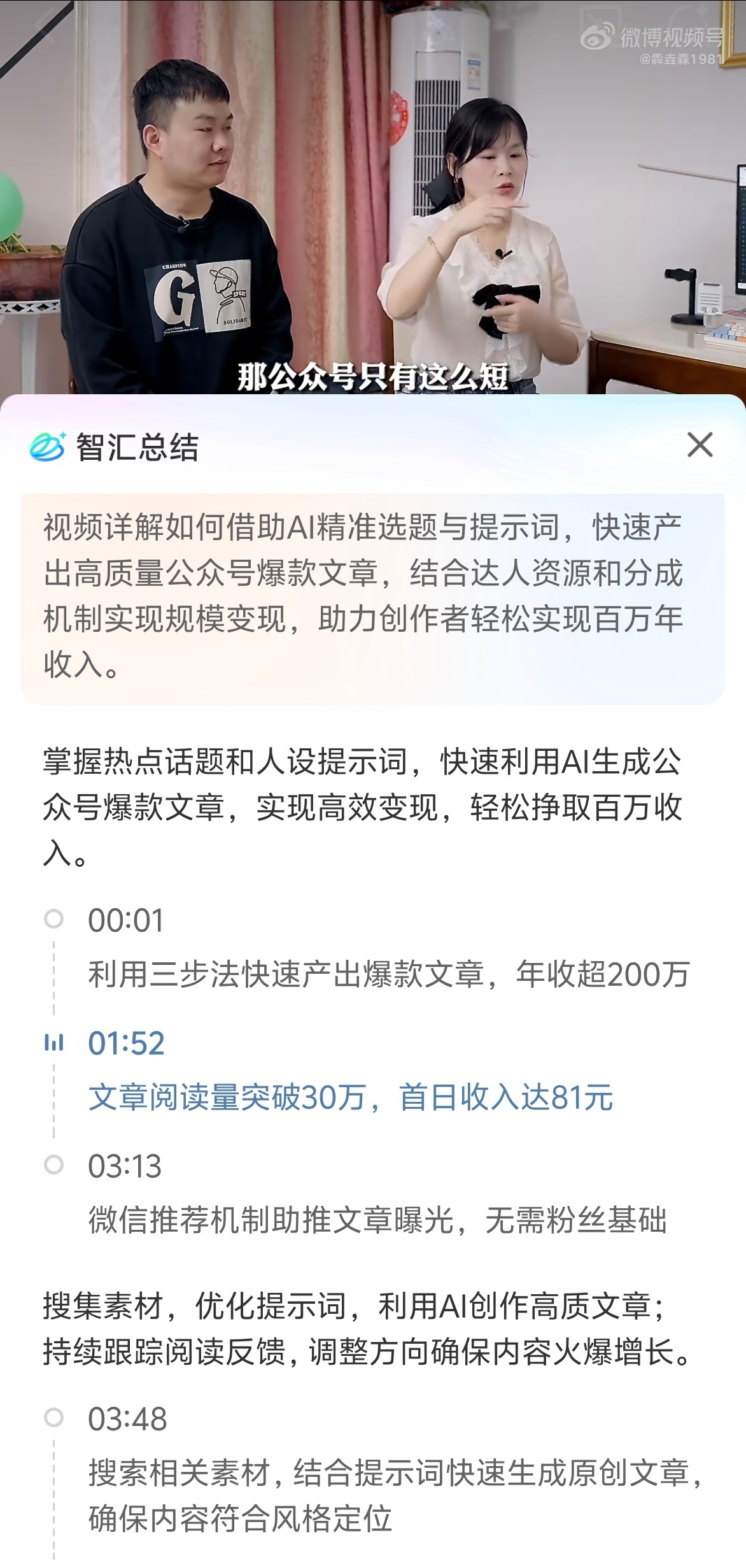 夫妻AI写公众号年赚200万 这种话题是在给年轻人创业信心吗?还是说夸赞Ai?引导年轻人做自媒体?