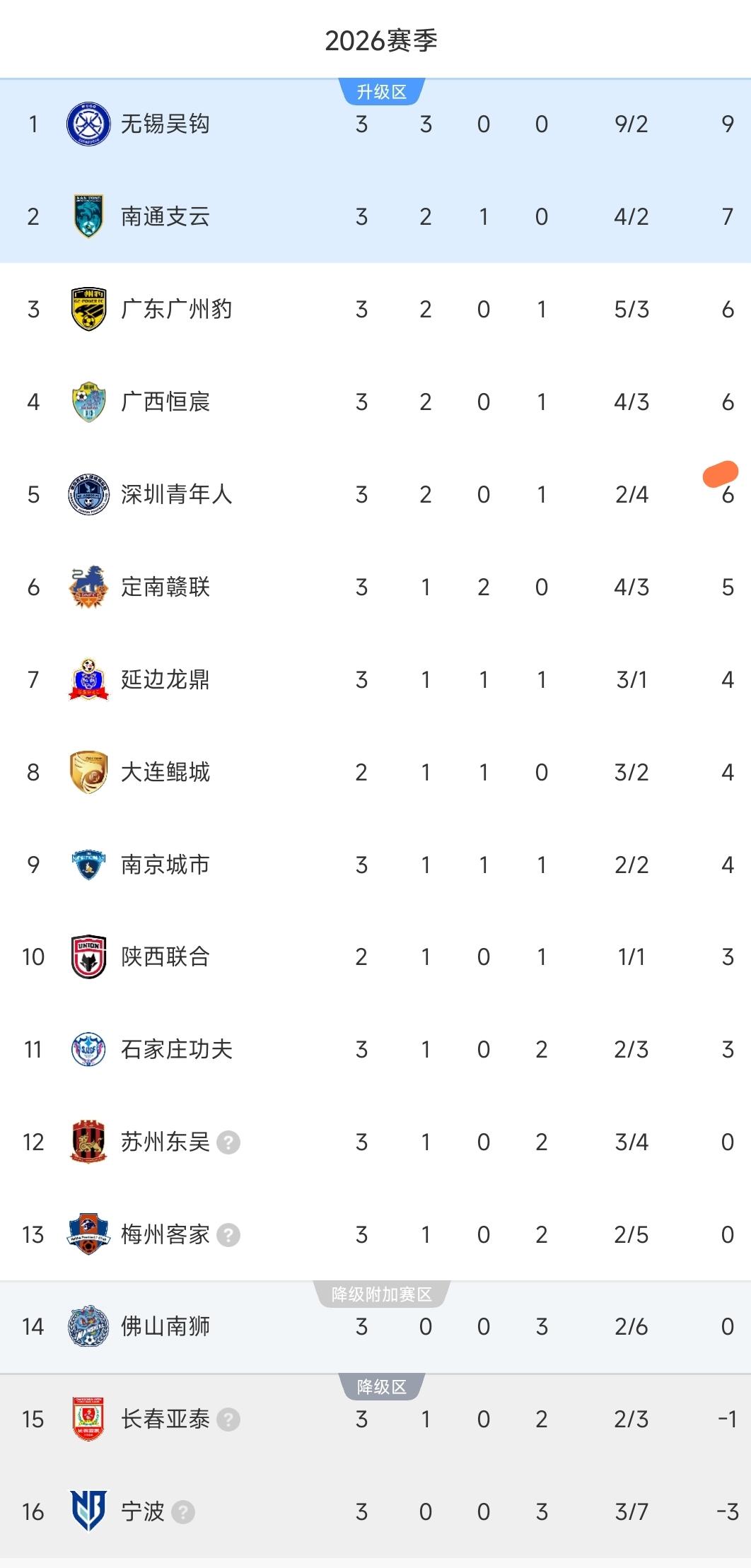 中甲3队迎来首胜! 陕西联合1-0,亚泰1-0终结两连败! 积分榜更新! 北京时间4月5日,中甲联赛第三轮。 ①陕西联合1-0石家庄功夫。 两队僵持许久,第73分钟伊兰杜斯特弧顶转身抽射入网,精彩世界波一锤定音,陕西联合1比0告捷,这也是队伍新赛季的首胜。 ②梅州客家1-0佛山南狮。 坐镇主场的南狮攻势不弱,恩迪亚耶第16分钟攻入一球但犯规无效,此后时间却再难有良机。梅州客家下半场的换人是立竿见影,替补的波佩斯库造点并罚进,剩余时间他们艰难守住1-0,终结两连败,收获第一场胜利。 ③长春亚泰1-0苏州东吴。 双方绝对机会寥寥,亚泰上半场第41分钟外援卡米洛进球但越位,随即又陷入激烈的缠斗,眼看迟迟没有建树,关键时刻还得老将站出来解决问题,第74分钟谭龙禁区破门制胜,1比0力克苏州东吴,他们终于迎来首胜。