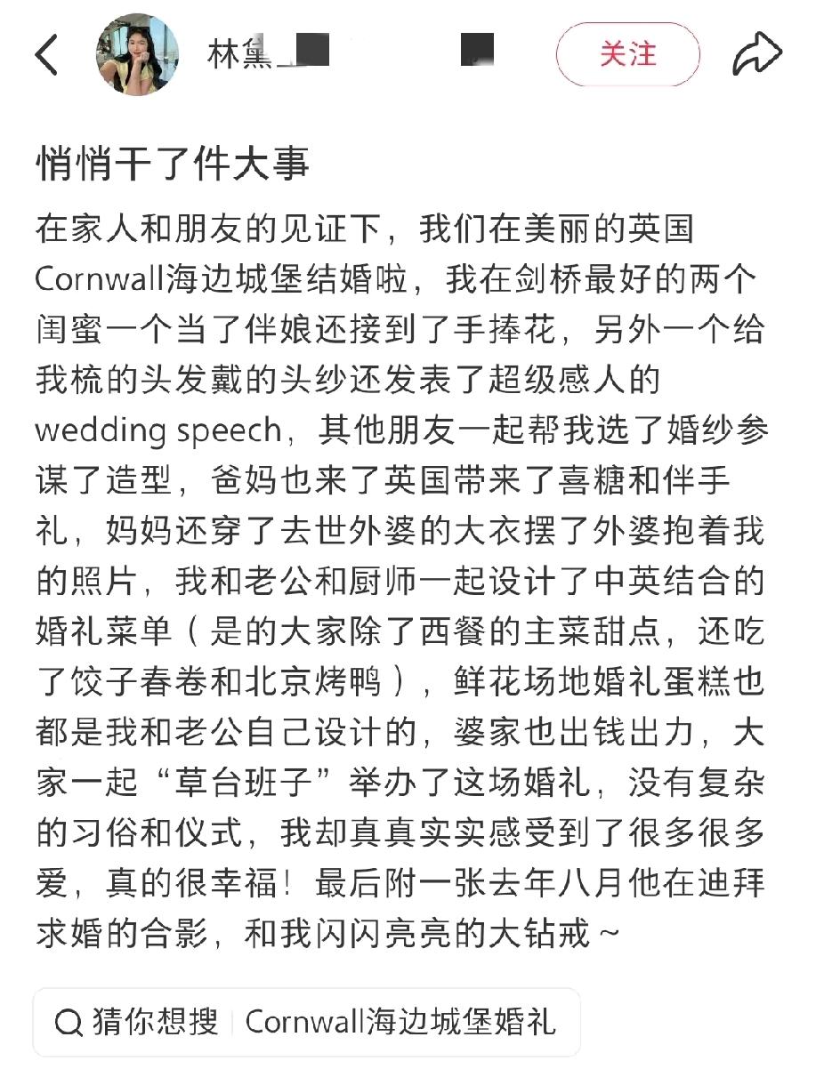 中英跨国情侣,克服一切障碍,在英国海边城堡举行婚礼。女生在英国剑桥留学时结识了男生,不被看好的跨国恋,俩人一起坚持走了下来。婚礼没有大排场,剑桥时的闺蜜、双方的父母,送上了伴手礼和祝福。女生表示虽然婚礼没有复杂的习俗和仪式,但她真真实实的感受到了很多爱意。风景很美、婚纱很美,新娘也很美,真爱无国界,祝福他们。