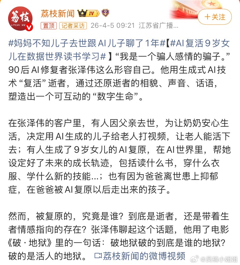 妈妈不知儿子去世跟AI儿子聊了1年看到这个新闻感觉鼻子酸酸的,我有个同事,非常不喜欢拍照,128g的手机内存,经常用不完还剩很多,一开始问他,他说他不爱拍照,他觉得当时的体验照片是记录不出来的,可是过了几年,发现很多来不及告别的人,已经只记得事情,记不得模样了刷到鲁豫和窦文涛的访谈,窦说他觉得其实人生最痛苦的事是不辞而别,如果真的有当面好好道别的机会,我想没人会想留下遗憾,AI如果能做到这件事,也算是给很多人的情感有了一份寄托