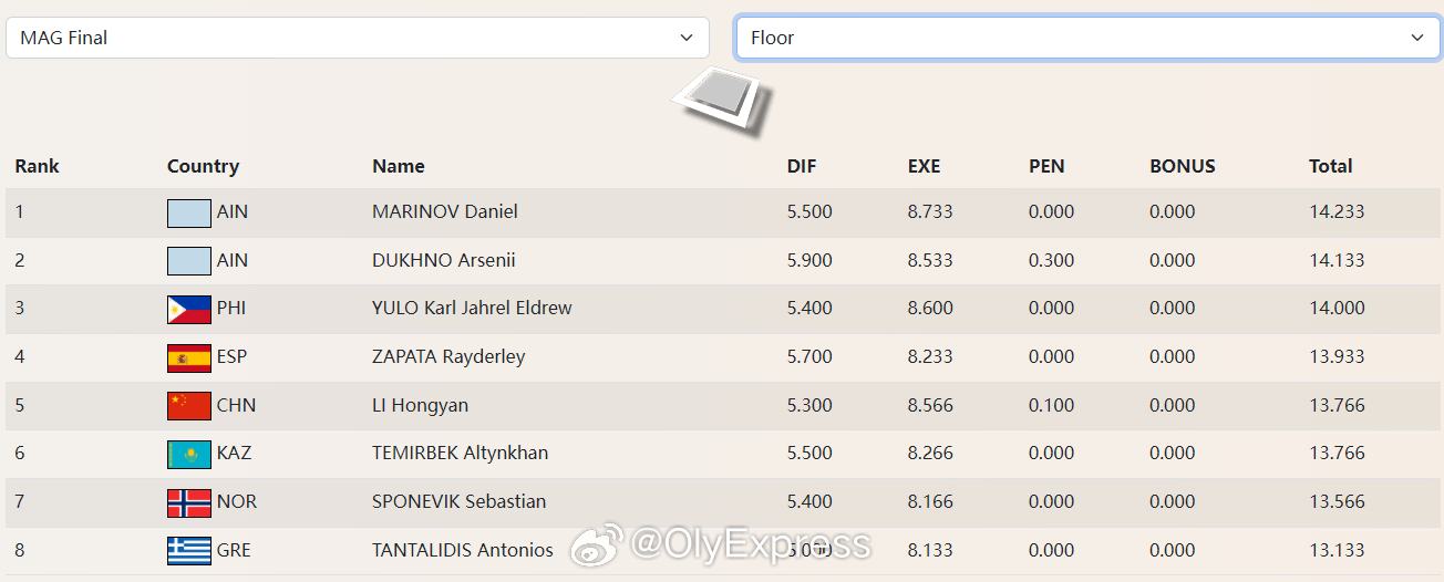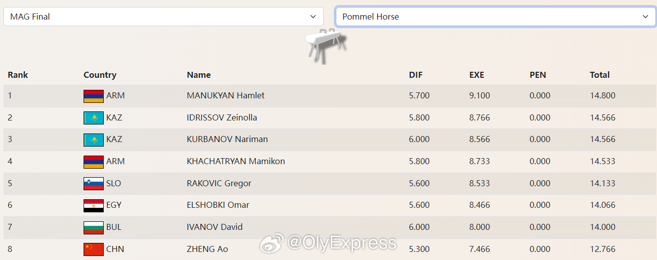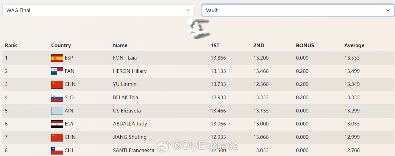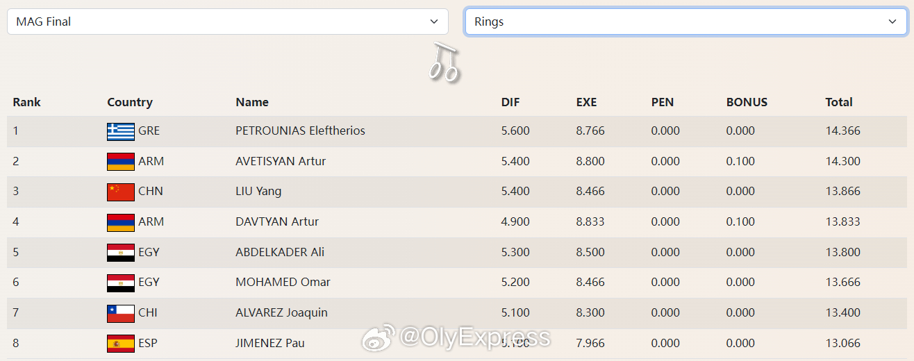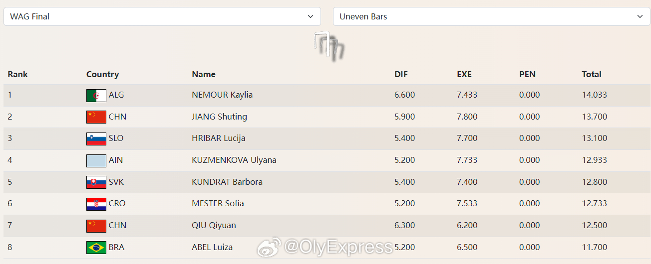 【体操世界杯埃及站首日中国夺1银2铜】 4月5日开罗,体操世界杯埃及站首个决赛日结束。在五个单项争夺中,中国选手夺得1银2铜。在女子高低杠比赛中,阿尔及利亚名将内莫尔以14.033分夺冠,中国选手蒋淑婷落后0.333分获得银牌,邱祺缘名列第七。虞琳敏和刘洋(湖南)分获女子跳马和男子吊环铜牌,蒋淑婷跳马名列第七。李鸿颜和郑奥分获男子自由操第五和鞍马第八。