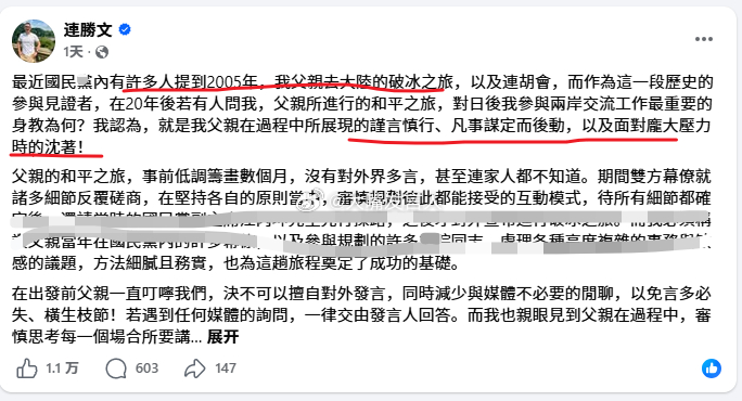 郑丽文女士后天要来,昨天连胜文发文,夸了自己的老爹,提及他爹在2005年访问大陆那次当然,连胜文也不愿意提及,郑丽文和陈凤馨,在他爹70岁生日时,穿网袜、跳热舞那一幕果档的人呀,遇到能占便宜的时候,一涌而上,前有马某九2023年访陆后飞机降落台北,一群蓝营人涌着去接机,叶元之演技最差,竟然还哭出来了这帮人倒是不说当时几天之前,他们没有一个人去送马这次连胜文发文,夸他爹在2025年(图1中红线),“谨言慎行、凡事谋定而后动,以及面对庞大压力时的沉着”,这句话写出来,肯定会有人解读成阴阳郑丽文。呵呵。热点观点 ,郑丽文将参观访问江苏上海北京 ,郑丽文支持者激动落泪说我是中国人