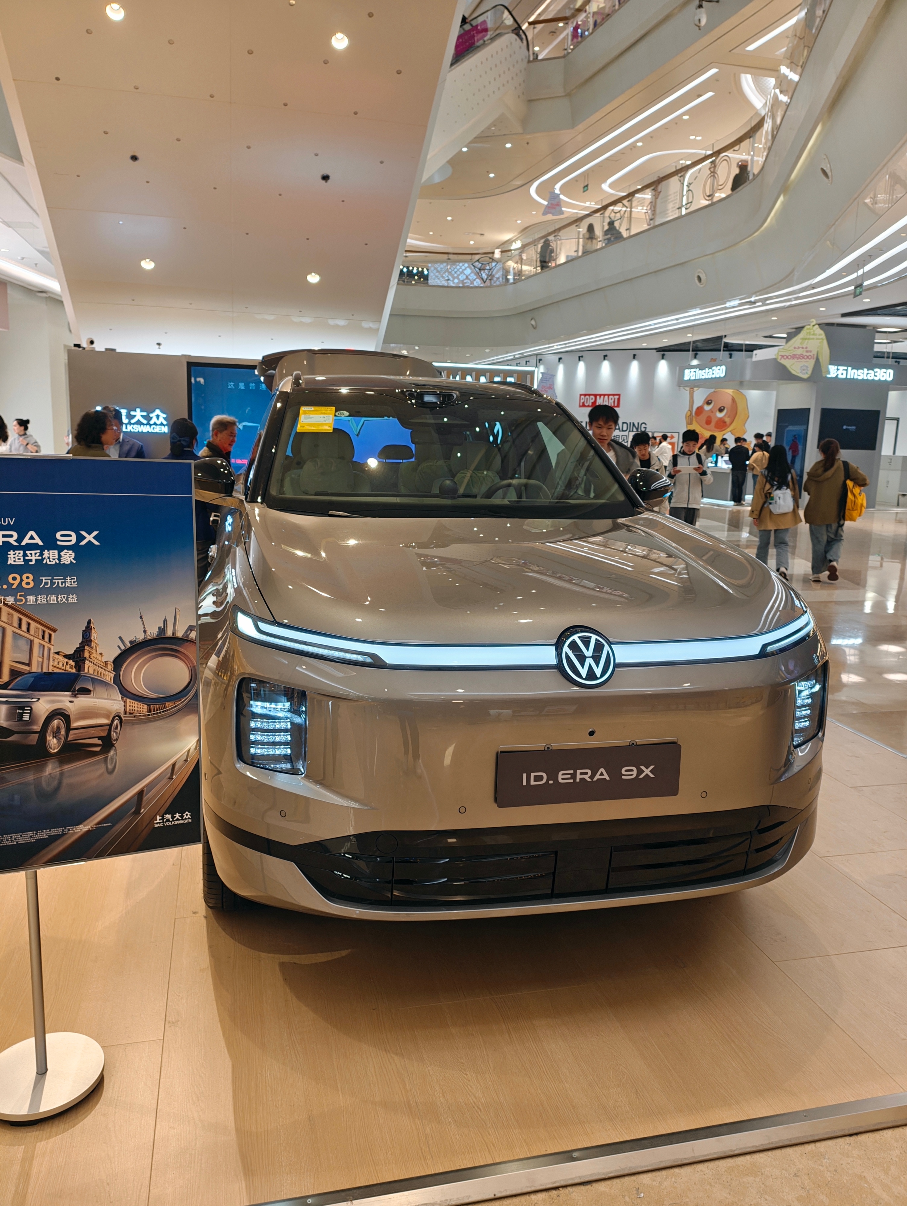 上汽大众ID.ERA 9X,今天在商场见到了,第一眼有点鹏子的感觉,完全不像大众的感觉,从内到外的不像,大六座,空悬、电视、舒适配置选完也要38了。第三排我坐进去腿不放不了,只能小朋友坐,或者应急。这个价位确实没有太大吸引力,可能得看优惠了。上汽大众id.家族