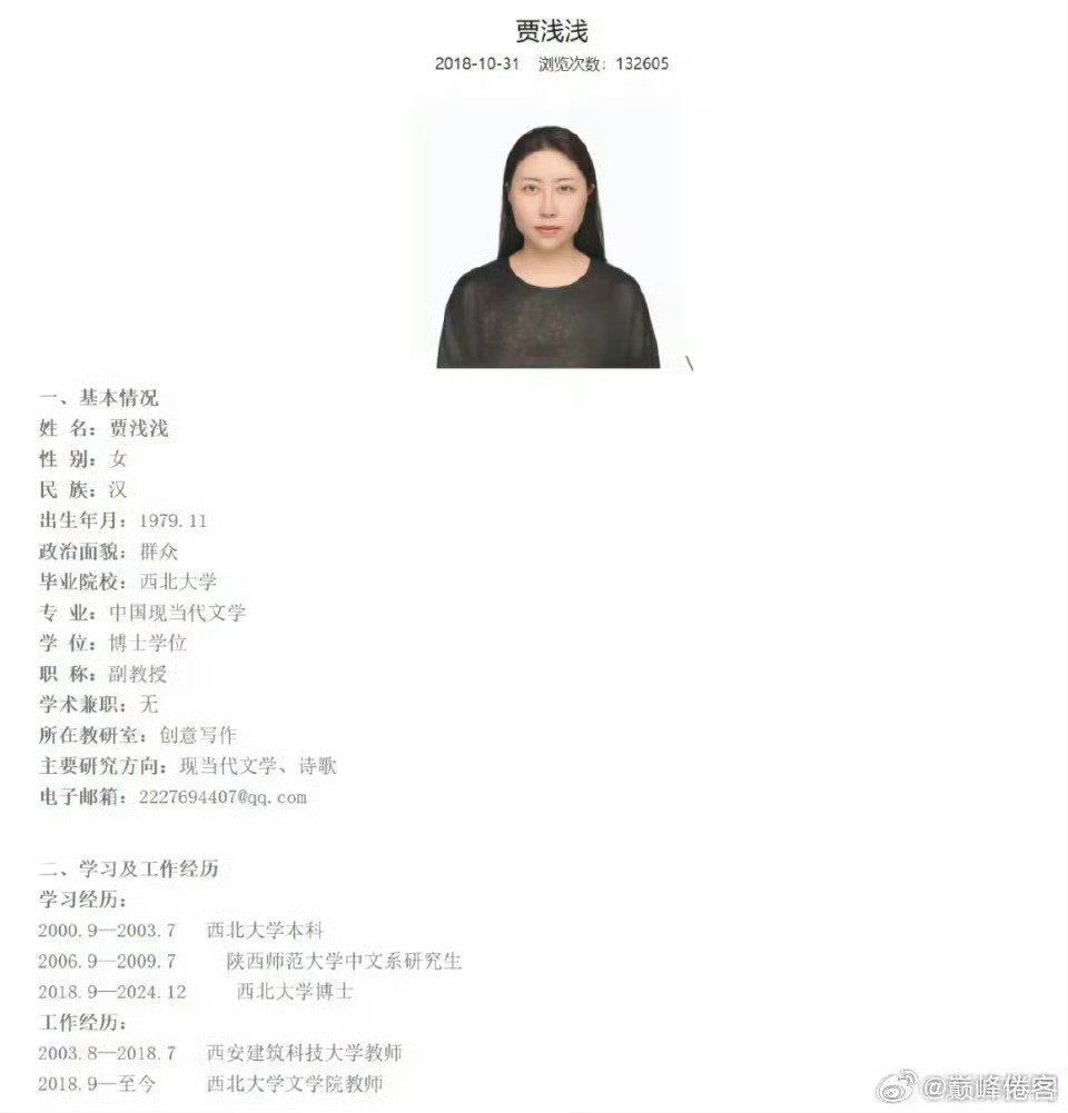 贾浅浅本人学历存疑,2003年,贾平凹担任西安建筑科技大学人文学院院长、文学院院长。2003年8月至2018年7月,贾浅浅担任西安建筑科技大学教师。贾浅浅是2018陕西青年文学奖得主,陕西青年文学奖由《延河》杂志社和陕西省青年文学协会共同发起设立,《延河》杂志的主编为贾平凹。下面是贾浅浅的学术成果,