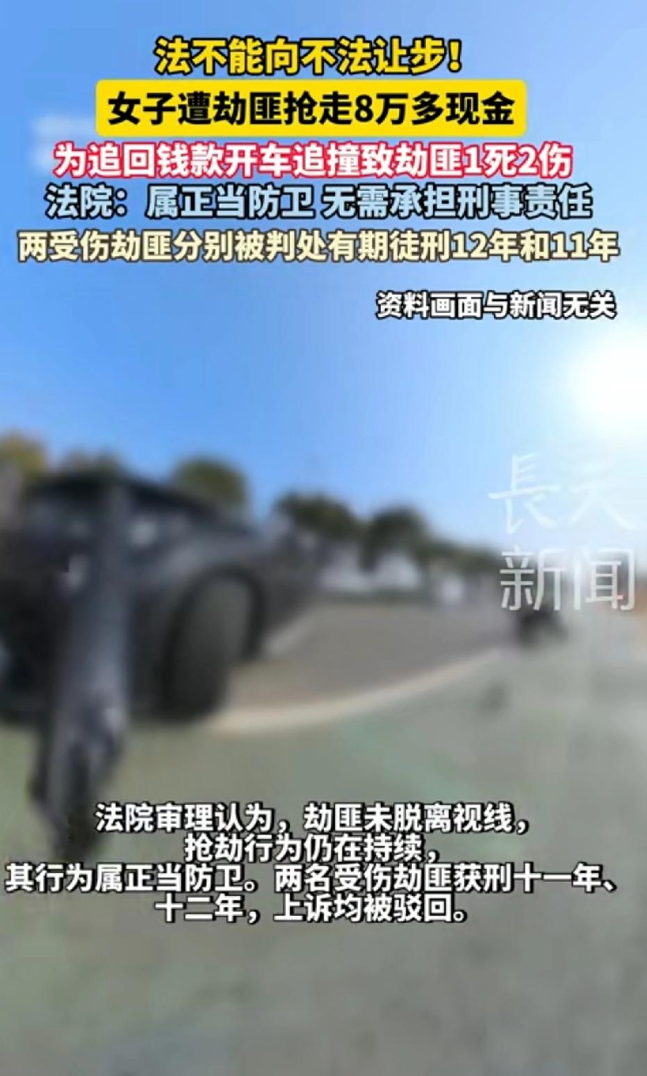 法不能向不法让步,女子遭劫匪抢劫8万多现金,为追回钱款开车追撞致劫匪1死2伤。法院:女子属正当防卫,无需承担刑事责任。俩受伤劫匪分别被判有期徒刑12年和11年。 “女子被抢8万后驾车撞劫匪致1死2伤”这事一出来,网上瞬间炸锅。凌晨5点,荣女士在地下车库被三名劫匪抢了辛苦攒下的8万周转金。她没坐以待毙,开车追了上去。 这一追,引发全民对正当防卫边界的大讨论。有人觉得劫匪跑了,追上去撞人是事后报复;也有人支持荣女士,认为面对暴力犯罪,防卫不应设限。好在法院给力,一审二审都判她正当防卫,无罪!劫匪也因抢劫罪获刑。 法院认定抢劫是连续过程,劫匪没脱离视线,不法侵害就没结束。而且劫匪持械,严重危及人身安全,荣女士符合特殊防卫条件。这判决给公众吃了定心丸,彰显“法不向不法让步”的精神。