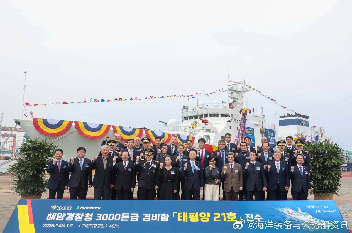 各国海上执法力量信息 【韩国】2026年4月1日,韩国海洋警察厅最新3000吨级新型警备舰“太平洋21”号(舷号ASR3021)在韩国现代重工集团蔚山造船厂下水。韩国海洋警察厅 【详细报道】网页链接