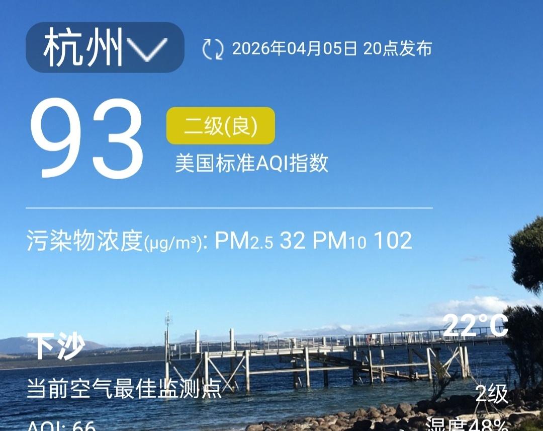 2026.4.5(星期天):清明节,杭州国标平均:88良。美标平均:93良。 杭州PM2.5影响和出行建议:今天杭州空气质量一般,正常人群可以正常活动。当前空气下进一步加剧易感人群症状,可能对健康人群心脏、呼吸系统有影响; 儿童、老年人及心脏病、呼吸系统疾病患者避免长时间、高强度的户外锻炼,一般人群适量减少户外运动。