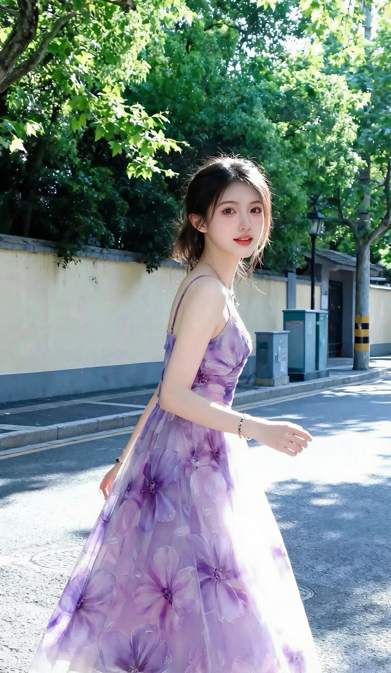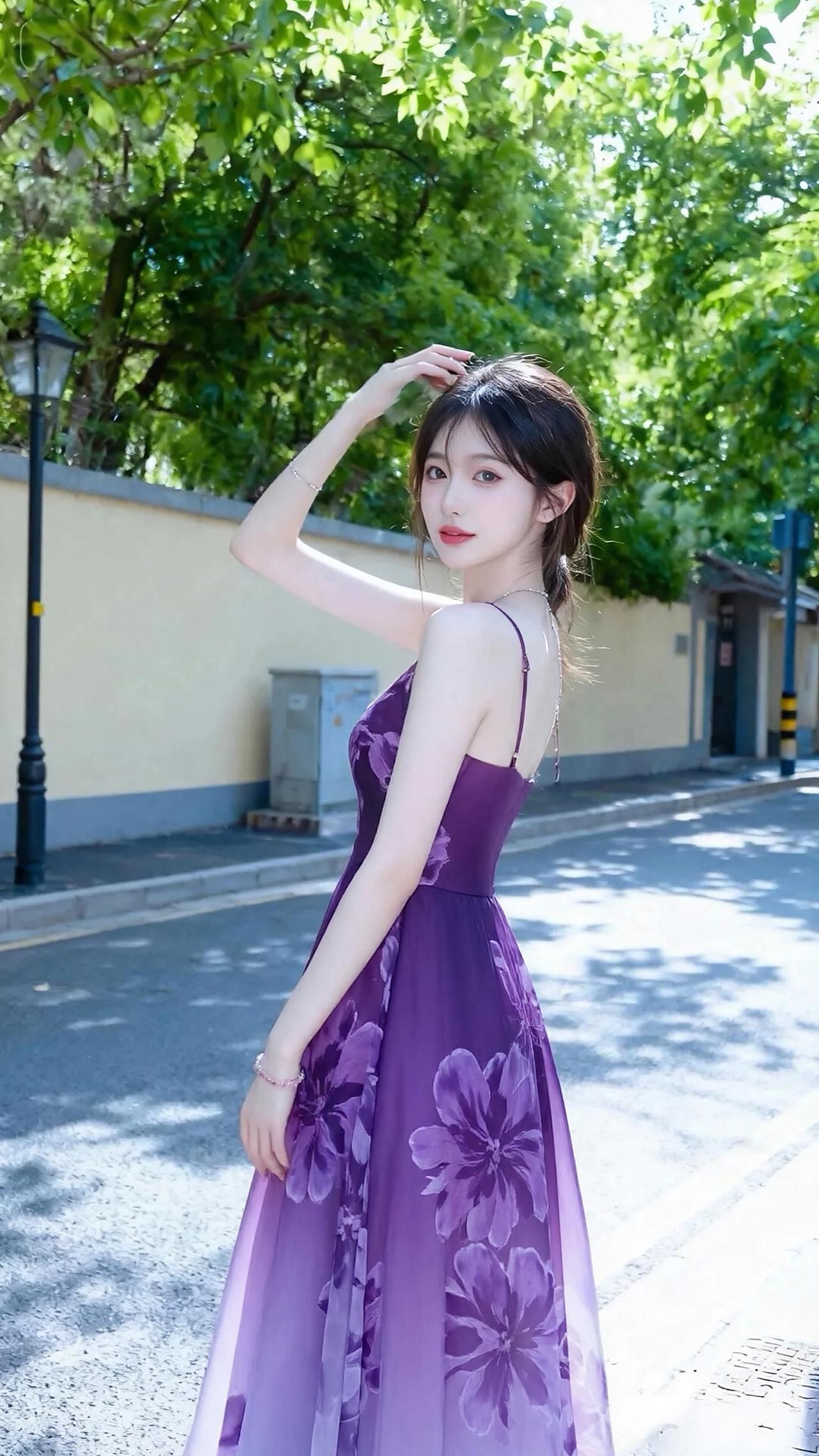 背景是绿意盎然的林荫街道,阳光透过树叶洒下斑驳光影,与她身上的紫色纱裙交相辉映,将少女的优雅、灵动与氛围感完美融合,每一帧都像电影里的唯美画面✨
