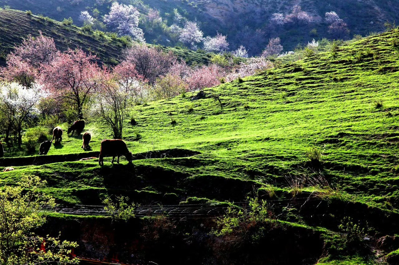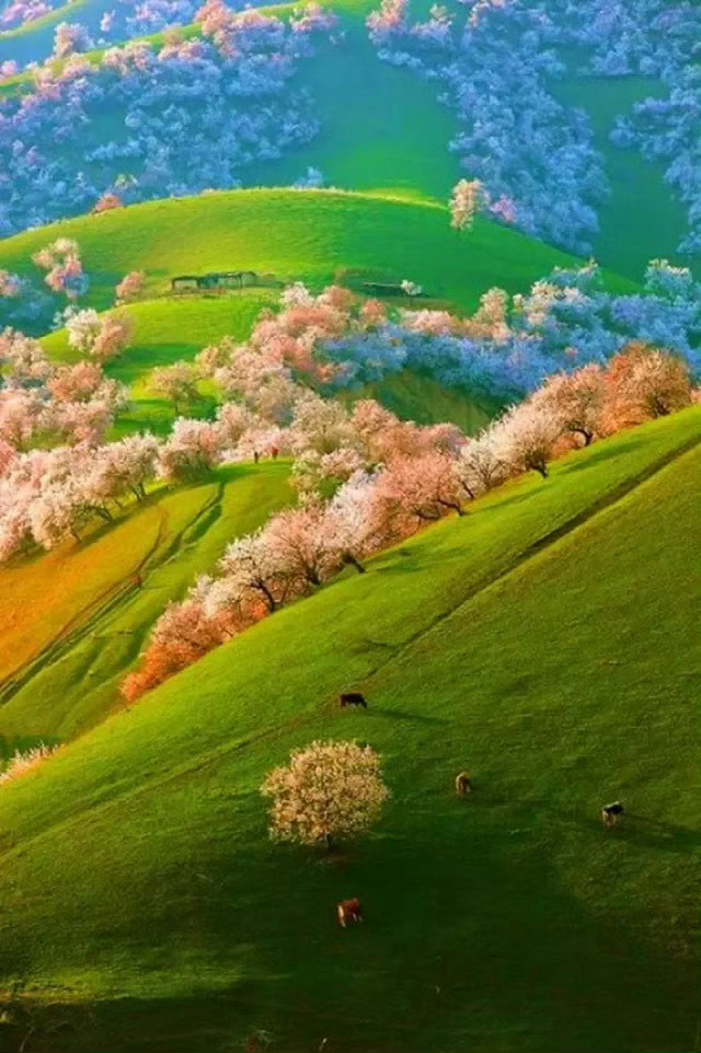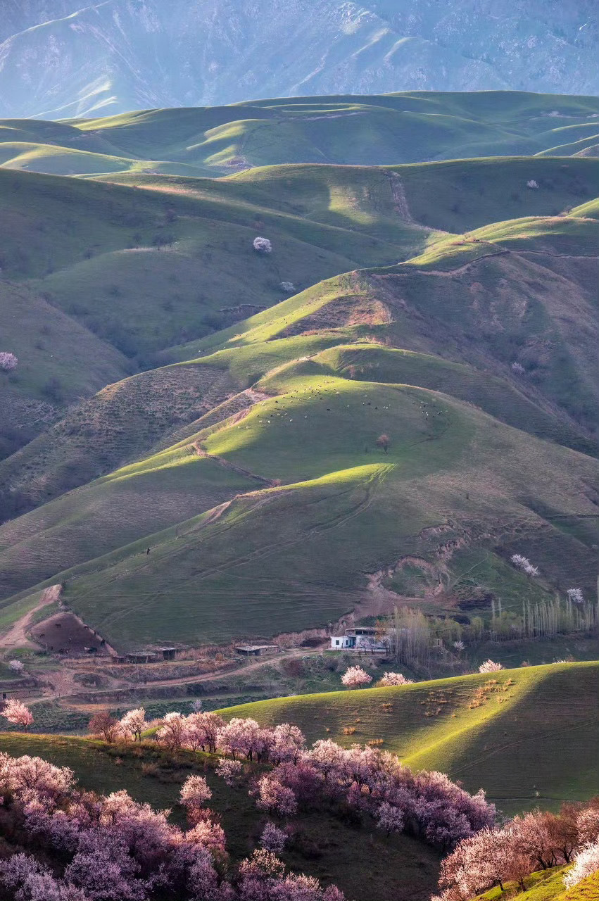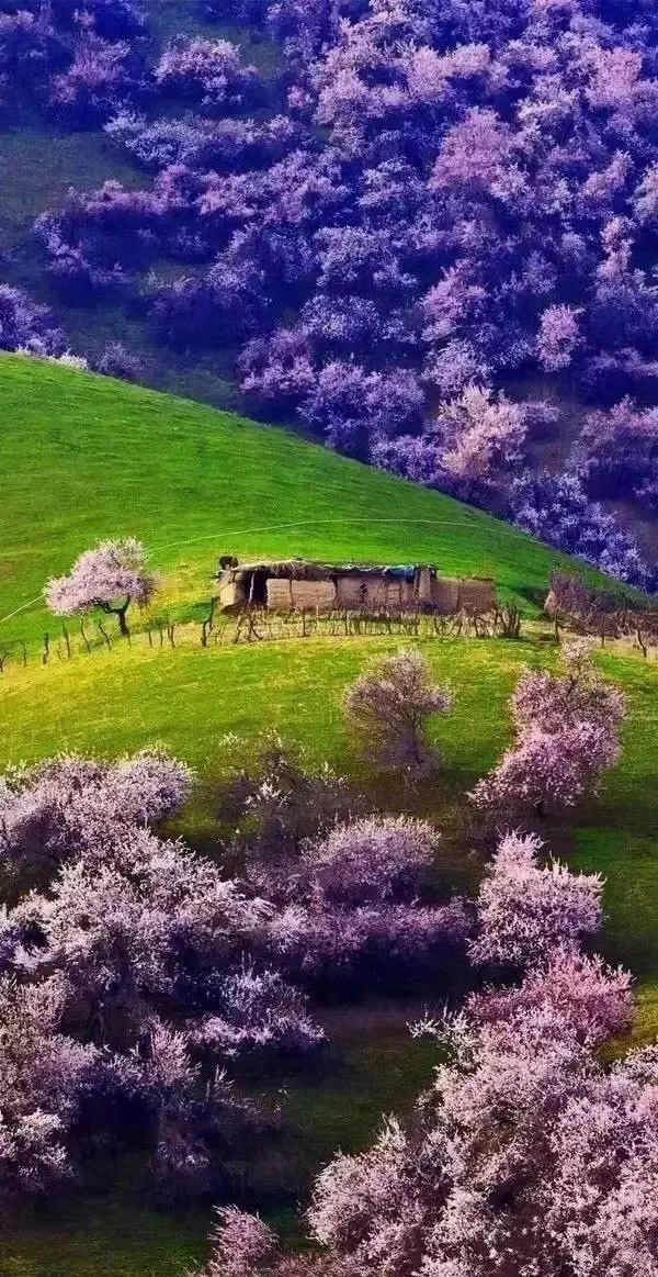 一到春天,伊犁就成了童话世界 春天初绿的山腰沟谷之间,一树树一丛丛的粉