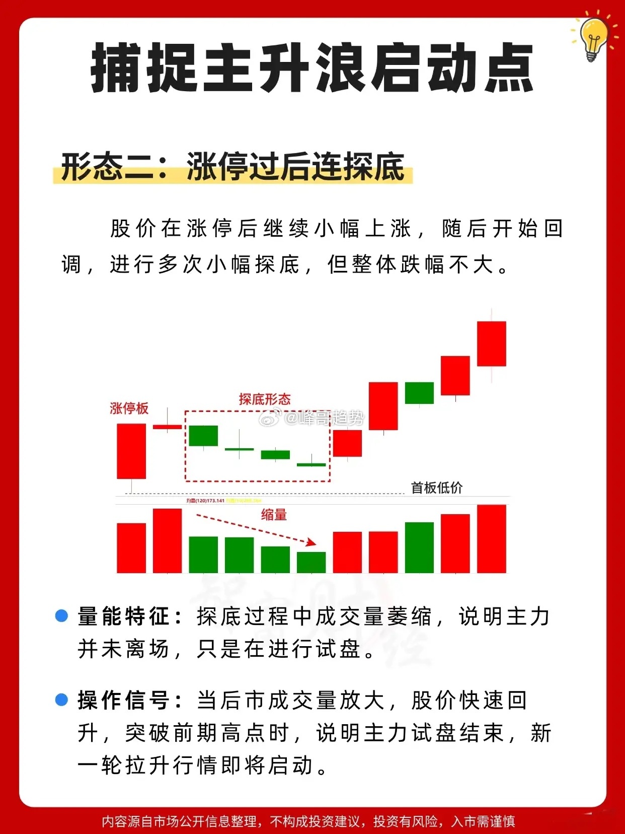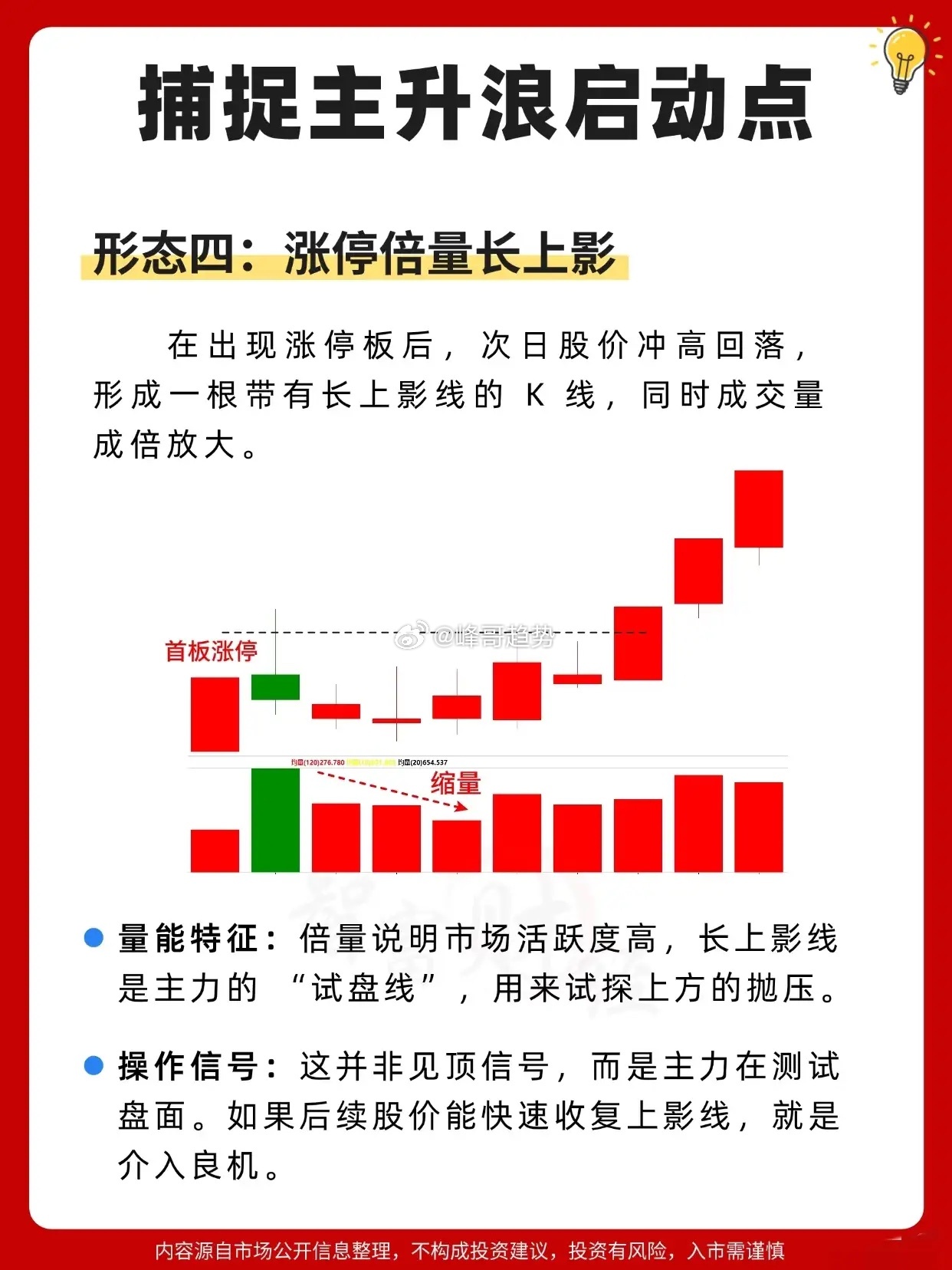抓准主升浪启动信号:4种经典形态,精准把握上车时机在A股的趋势行情里,主升浪是收益最丰厚的阶段,但很多投资者要么踏空、要么追高被套,核心就是没看懂主力洗盘的信号,错过了最佳启动点。下面这4种经过市场反复验证的经典形态,帮你精准识别主力意图,抓住主升浪的上车窗口。第一种是回调不破涨停底,这是最经典的主力洗盘手法。股价拉出涨停后,回调的低点始终没有跌破涨停板的最低价,说明主力在牢牢守住关键支撑。量能上呈现“上涨放量、回调缩量”的特征,意味着抛压在持续减轻,洗盘只是短期清洗浮筹。一旦后续再次出现放量阳线,就是洗盘结束、新一轮拉升开启的明确信号。第二种是涨停过后连探底。股价涨停后小幅冲高,随后进入多次小幅探底的阶段,但整体跌幅可控,始终没有跌破首板的低价。探底过程中成交量持续萎缩,说明主力资金并未离场,只是在通过试盘清洗不坚定的筹码。当后续成交量放大、股价快速回升并突破前期高点时,就意味着试盘结束,主升浪正式启动。第三种是连阳倍量再回踩。股价在低位走出连续阳线,成交量同步成倍放大,呈现出量价齐升的健康态势,说明主力在持续吸筹。随后股价缩量回踩支撑位,这是典型的良性洗盘,而非主力出货。当出现一根放量阳线反包洗盘阴线时,就是洗盘结束、主升浪开启的黄金信号。第四种是涨停倍量长上影。首板涨停后,次日股价冲高回落,收出一根带长上影线的K线,同时成交量成倍放大。这并非见顶信号,而是主力的“试盘线”,用来测试上方的抛压强度。如果后续股价能快速收复上影线,就是主力确认抛压可控、准备拉升的介入良机。风险提示:投资有风险,入市需谨慎。本文仅为技术形态分享,不构成任何投资建议,个股操作需结合市场环境、基本面综合判断,理性投资。a股财经今日看盘