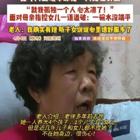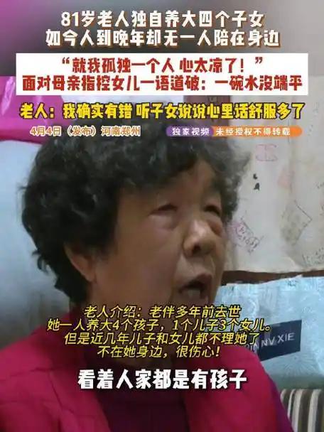 郑州八旬老人哭诉无人养老,四个子女反目成仇,偏心真的能毁了一个家? (个人观点仅供参考,无任何不良引导) 河南郑州这场八旬老人的养老闹剧,彻底炸翻了全网。81岁的老人哭诉自己孤身一人,身边连个端茶倒水的亲人都没有,四个子女个个不管不顾。可当真相浮出水面,没人再同情老人,反而都在指责她——这哪里是子女不孝,分明是她几十年偏心种下的苦果,亲手把本该温暖的家,搅成了一地鸡毛。 老人一辈子守着寡,含辛茹苦把四个孩子拉扯大,本想着“养儿防老”,晚年能享儿孙绕膝的福。谁曾想,如今步履蹒跚的她,只能对着空屋子抹眼泪,逢人就抱怨子女冷血无情。可她的女儿站出来,一句话戳破了所有假象:“不是我们不养老,是她从来没把我们当自己人!” 这话不是无理取闹,而是憋了几十年的委屈。老人这辈子的“一碗水”,从来就没端平过。当年家里老房拆迁,两套新房全给了儿子,女儿们连一句解释都没等到;家里的拆迁款、老人半生的积蓄,全被她一股脑送给了儿子,女儿们连边都沾不上。就连父亲留下的工作名额,她也毫不犹豫给了儿子,女儿们的前途,在她眼里根本不值一提。 四个女儿并非冷血动物,赡养的责任从来没推脱。医药费、生活费,该出的一分不少,甚至主动提出接老人同住。可老人呢?住不了两天就摔摔打打,挑三拣四,眼里心里只有儿子。儿子偶尔来一趟,她就笑逐颜开;女儿们忙前忙后,她却视而不见。这样的相处,谁能不寒心? 网友们的评论一针见血:“种瓜得瓜,种豆得豆,老人晚年的孤独,全是自己作的!”是啊,多少父母总觉得“儿子才是传宗接代的根”,把所有资源都倾斜给儿子,却忘了女儿也是十月怀胎生下来的骨肉。年轻时,女儿们忍气吞声,想着父母总有醒悟的一天;可等到老了才发现,偏心的毛病早刻进了骨子里,想改早已来不及。 养儿防老,本是执念;公平相待,才是底线。赡养不只是法律规定的义务,更是心与心的交换。你年轻时亏待了女儿,别想老了还能让她毫无怨言地伺候你;你把家产全给了儿子,也别指望女儿来给你养老兜底。亲情从来不是单向的索取,而是双向的奔赴,父母懂得公平,子女才愿付出真心。 家是讲爱的地方,不是计较公平的赛场。别让偏心,寒了子女的心;别让执念,毁了晚年的福。愿所有父母都明白,儿女都是心头肉,一碗水端平,才是给子女最好的礼物;也愿所有子女能记取,养育之恩重如山,可唯有真诚相待,才能让亲情永不褪色。别等失去了才懂得珍惜,别让偏心,成为一辈子的遗憾。