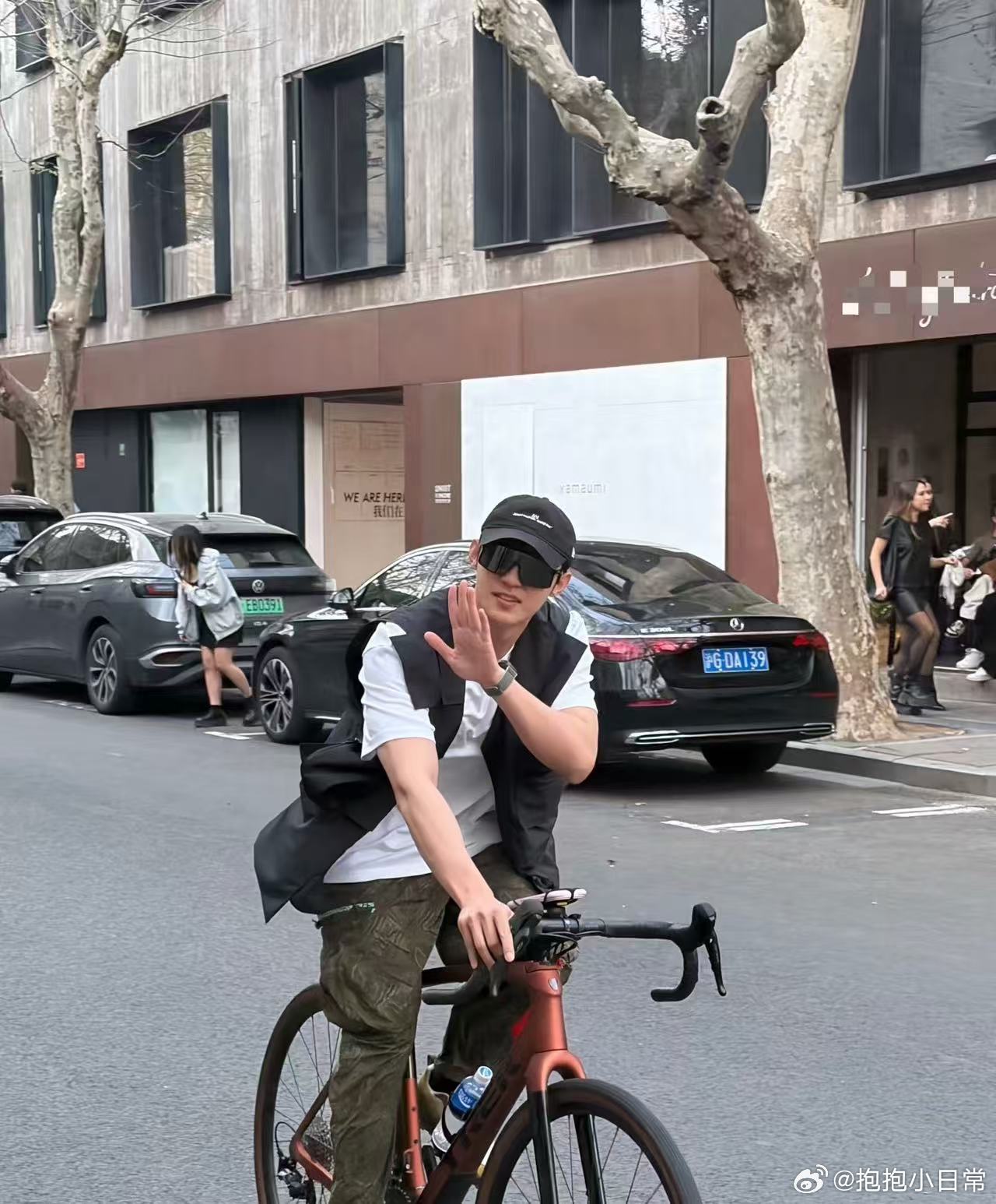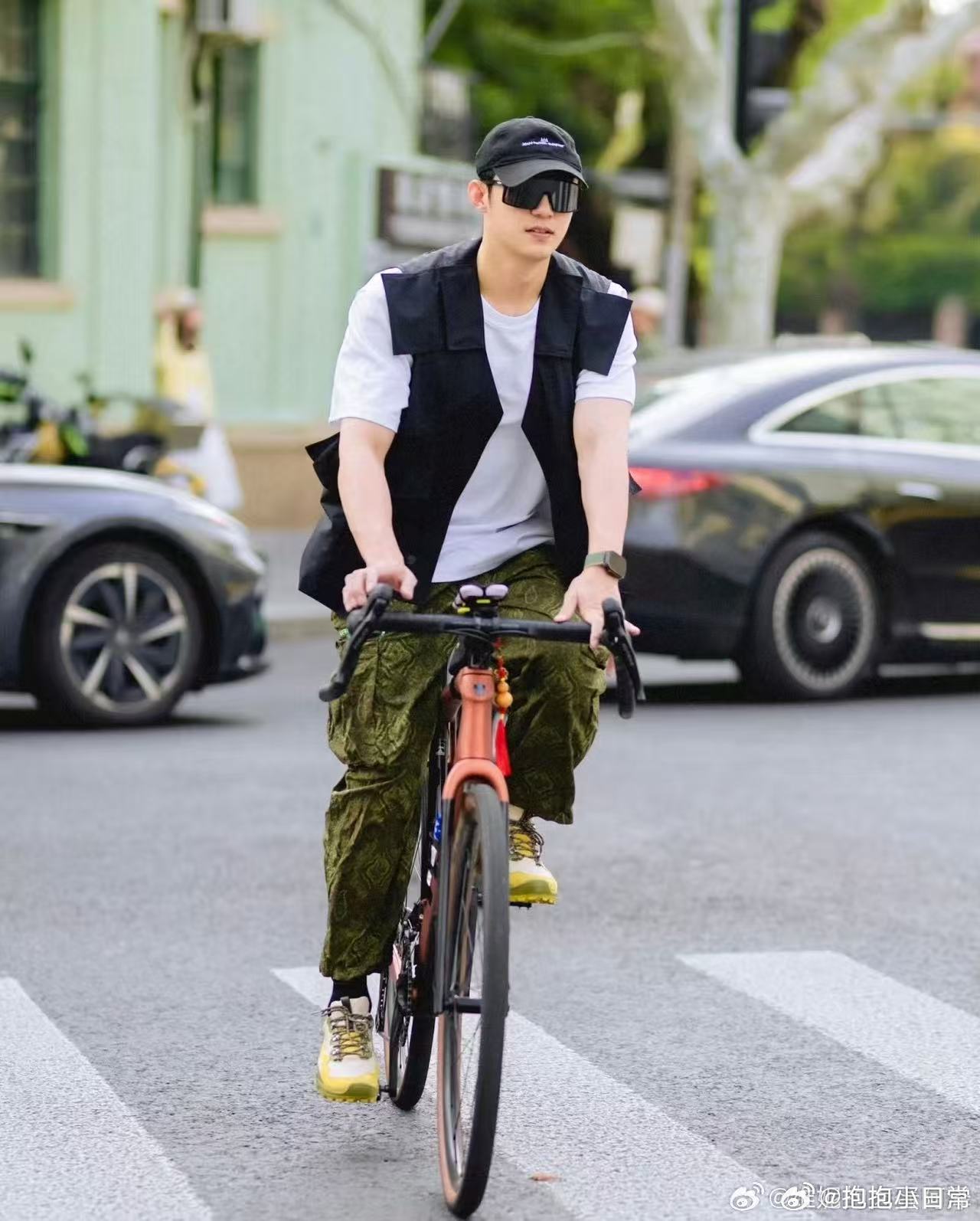 网友上海偶遇黄景瑜骑车 果然帅哥就算穿基础款也出彩,黄景瑜马甲配棒球帽,简简单单