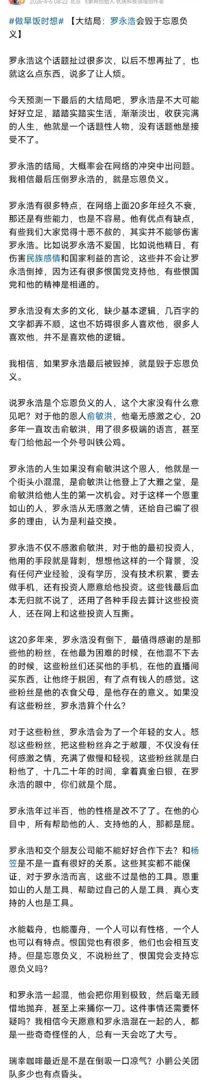 项立刚:“罗永浩大概率会在网络冲突中出问题,最后压倒罗永浩的,就是忘恩负义”。