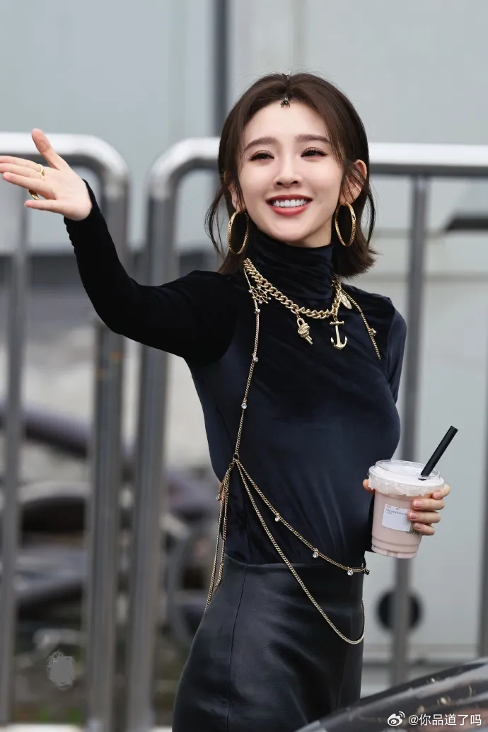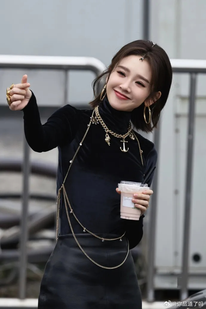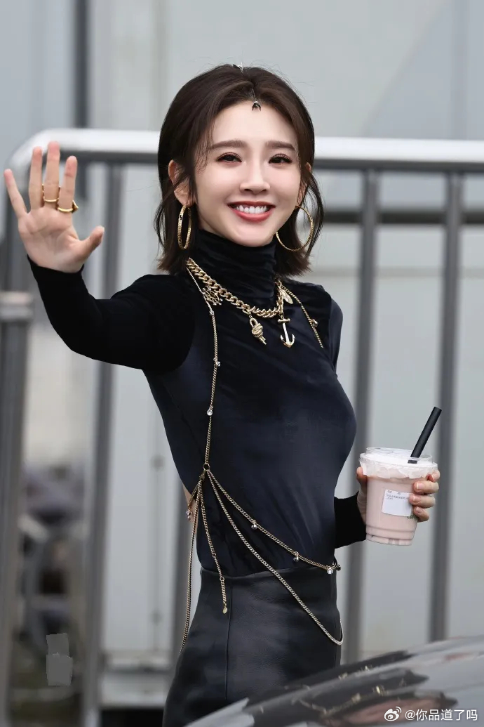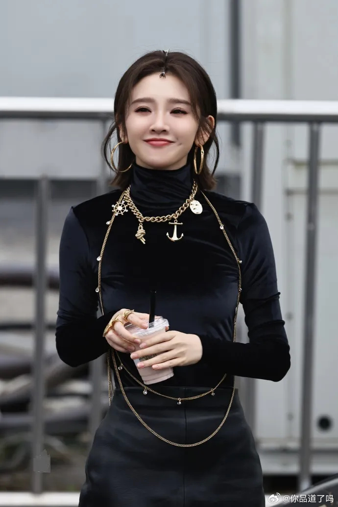 唐艺昕浪姐黑色造型微改文案唐艺昕在录制《浪姐》时,一身全黑造型酷感十足,气场直接拉满。上身选择黑色紧身长袖衫,搭配黑色皮质短裙,完美勾勒出优越的身材比例,纤细腰肢与曼妙曲线尽显,高贵气质扑面而来。脚踩黑色尖头高跟鞋,干练又犀利,时尚魅力满分;脖颈间点缀银色项链,为整体造型增添了精致奢华感,潮流感与高级感兼具,整体造型效果格外出彩。