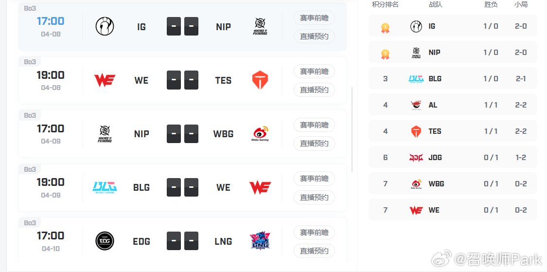 LPL第二赛段开赛之后的几场比赛走向出乎预料iG零封TES,AL零封WBG,本来以为AL能轻取TES,结果滔搏哥TES零封了AL,所以现在的局面是iG>TES>AL>WBG4月8号冲击连胜的iG直面NIP,后者前两天零封了WE,看看这场谁能赢~
