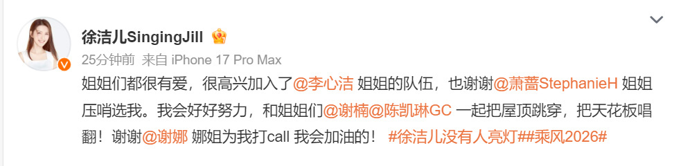 徐洁儿高情商回应“没人亮灯”:是大家还不够了解我,用舞台证明一切!徐洁儿回应没有人亮灯乘风2026