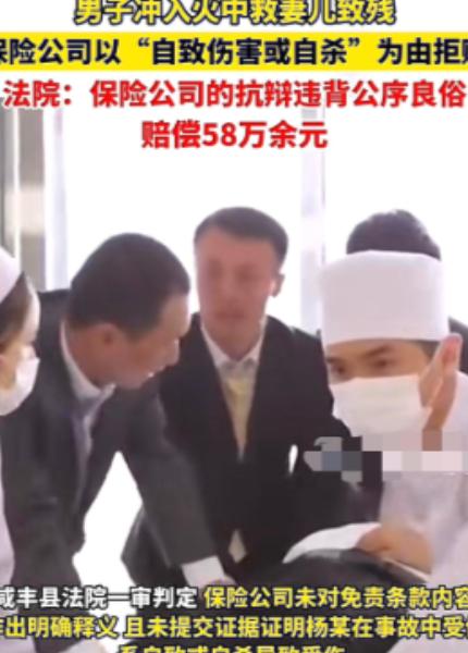 湖北,一男子家中失火,妻儿被困屋内,男子冒死冲进火场将家人救出,却全身烧伤!事后男子向保险公司索赔,对方竟认为男子是故意“自残”,而拒绝赔付!男子一怒之下将其告上法庭索赔58万,而法院这样判! 那天晚上十点多,杨某刚收拾完厨房,妻子带着孩子在卧室准备休息。 客厅角落的一台老旧插线板。长年负荷运转,加上线路老化,电流短路的一瞬间,一道火花“啪”地炸开,紧接着火苗顺着沙发边缘迅速蔓延。几分钟内,客厅已经被浓烟吞噬。 最先察觉异常的是杨某。他闻到一股刺鼻的焦糊味,从厨房探头一看,顿时脸色煞白——客厅已经起火,火势正向卧室方向逼近。 “着火了!”他大喊一声。 妻子慌乱中抱起孩子,但卧室门外已经被浓烟封住。火焰噼啪作响,黑烟滚滚涌入房间,空气迅速变得稀薄而灼热。孩子被呛得哭喊,妻子也慌了神。 那一刻,杨某没有任何犹豫。 他冲进厨房,拿起一条湿毛巾捂住口鼻,又迅速把一桶水泼向火势最猛的地方,但这点水对已经燃起的火来说杯水车薪。火舌舔着天花板,温度急剧升高,连墙皮都开始剥落。 邻居已经开始敲门,大喊报警,但杨某根本顾不上这些。他心里只有一个念头——“人还在里面!” 他深吸一口气,用湿毛巾裹住头脸,弯着腰冲进火海。 浓烟让人几乎睁不开眼,热浪扑面而来,像一堵无形的墙。杨某几乎是凭着记忆摸索着前进。他的手臂被火焰灼到,皮肤瞬间起泡,但他没有停。 他一脚踹开卧室门,妻子已经被烟呛得几乎站不稳,孩子在怀里哭得撕心裂肺。 “跟我走!”他嘶吼着。 他把湿毛巾塞给妻子,又用自己的身体挡在前面,硬生生在火与烟之间开出一条路。短短十几步的距离,却像穿越地狱。 火焰已经烧到门框,木门发出“咔嚓”的爆裂声。杨某一把抱起孩子,另一只手拉着妻子,几乎是拖着她往外冲。 就在他们冲出门的一瞬间,客厅的吊顶轰然塌落。 三人跌出门外的那一刻,楼道里的空气显得格外清冷。妻子瘫坐在地,孩子哭得几乎虚脱,而杨某则倒在一旁,身上的衣服已经被烧得焦黑。 邻居们冲上来帮忙,有人拿水,有人打电话。很快,消防车和救护车的警笛声划破夜空。 医院里,杨某被确诊为大面积烧伤,烧伤面积超过40%。他的双臂、背部和面部都不同程度受伤,甚至一度有生命危险。 接下来的日子,是漫长而痛苦的治疗过程——清创、植皮、反复换药,每一次都像在刀口上走一遍。 妻子每天守在病床前,看着他因为疼痛而咬紧牙关,眼泪止不住地流。孩子还小,不懂发生了什么,只是反复问:“爸爸什么时候能回家?” 几个月后,杨某终于脱离危险,但身体留下了明显的伤疤,行动也受到影响,无法再从事原来的体力工作。家庭的经济压力一下子压了下来。 这时,杨某想起自己曾购买过一份人身意外保险。当初只是出于防范心理,每年缴纳保费,从未想过真的会用上。 他整理好住院记录、消防出警证明以及相关材料,向保险公司提出理赔申请,金额为58万元。 然而,让他万万没想到的是,保险公司的答复却让他愤怒至极。 对方以“行为性质存疑”为由,认定杨某“主动进入危险环境”,属于“故意行为导致伤害”,甚至暗示其存在“自残获取保险赔偿”的嫌疑,因此拒绝理赔。 那一刻,杨某几乎不敢相信自己的耳朵。 “我冲进火里,是为了救我老婆孩子!”他声音沙哑地说。 但对方态度冷漠,只是重复合同条款中的“免责条款”,坚持不予赔付。 压抑已久的情绪在这一刻彻底爆发。杨某决定拿起法律武器,为自己讨一个公道。他将保险公司告上法庭,索赔58万元。 庭审当天,杨某带着满身伤疤站在原告席上。那一刻,他的伤痕比任何语言都更有说服力。 法院在审理过程中,调取了消防部门的出警记录、火灾原因认定书以及现场证人证言。多名邻居出庭作证,证明杨某是在明知危险的情况下,为救出妻儿才冲入火场。 法官在庭上明确指出: 杨某的行为,属于在紧急情况下为保护他人生命安全所作出的本能反应,符合社会公认的道德与法律价值取向。这种行为不仅不是“故意自残”。 最终,法院当庭宣判:支持杨某的全部诉讼请求,判令保险公司在限期内支付58万元理赔款。
