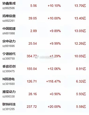 3月6日主力净流入前十个股:1、协鑫集成2、拓维信息3、中国能建4、宗申动力5、宁德时代6、香农芯创7、N固德电8、潍柴动力9、联特科技10、南网数字声明:所有资讯内容不构成投资建议,股市有风险,投资需谨慎。a股