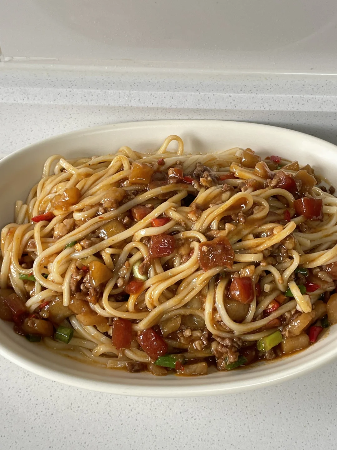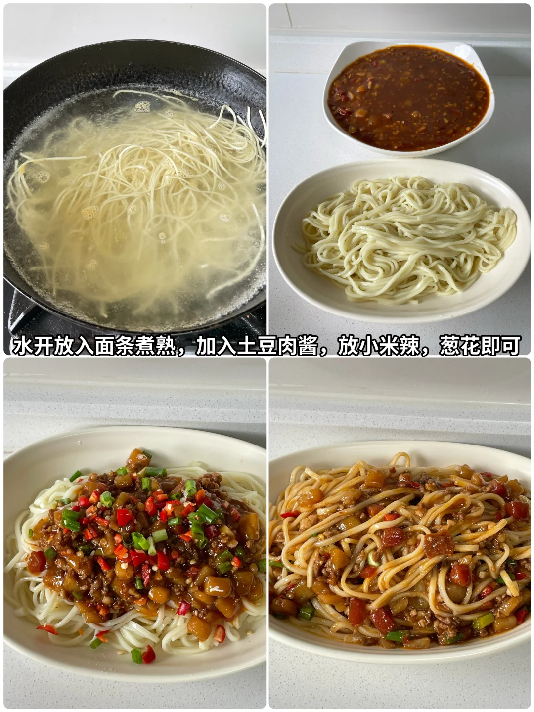 水开放入面条煮熟盛出,放上炒好的土豆肉酱。加入葱花,因为我喜欢吃生椒的味道,所以就加入了小米辣,这样做出来的土豆肉酱面最好吃,喜欢的姐妹可以试一试。