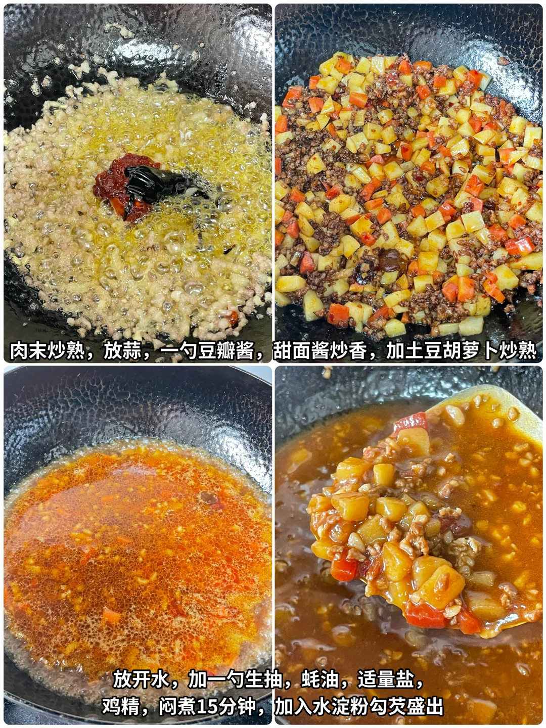 油热放入肉末炒熟,加入蒜炒出蒜香味,放入1勺豆瓣酱,1勺甜面酱炒出酱香味,加入土豆、胡萝卜炒断生,放入开水。加入1勺生抽、1勺蚝油、适量的鸡精盐,焖煮15分钟,然后再倒入水淀粉勾芡至浓稠即可出锅。