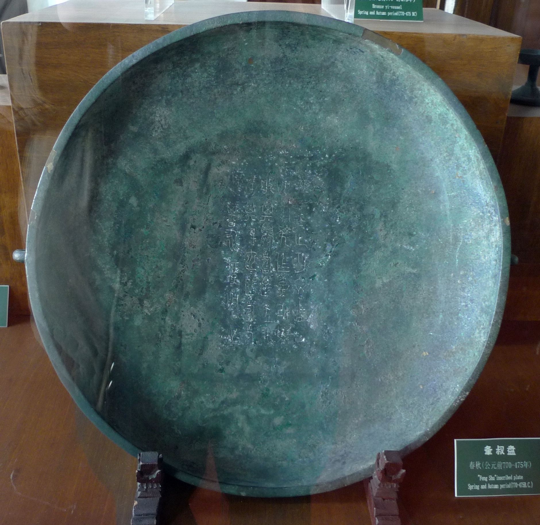 每天一件青铜器 辽宁旅顺博物馆藏春秋晚期:夆叔盘. 与上海博物馆收藏的夆叔匜是同铭的一组器物. 是罗振玉旧藏. 铭文纪“唯王正月初吉丁亥夆叔作季妃盥般,其眉寿万年永保其身,它熙熙寿考无期,永保用之.” 可惜的是这件盘是仅有残底和铭文没问题,盘身都是后修补而成, 原本应该跟匜一样有红铜镶嵌纹饰
