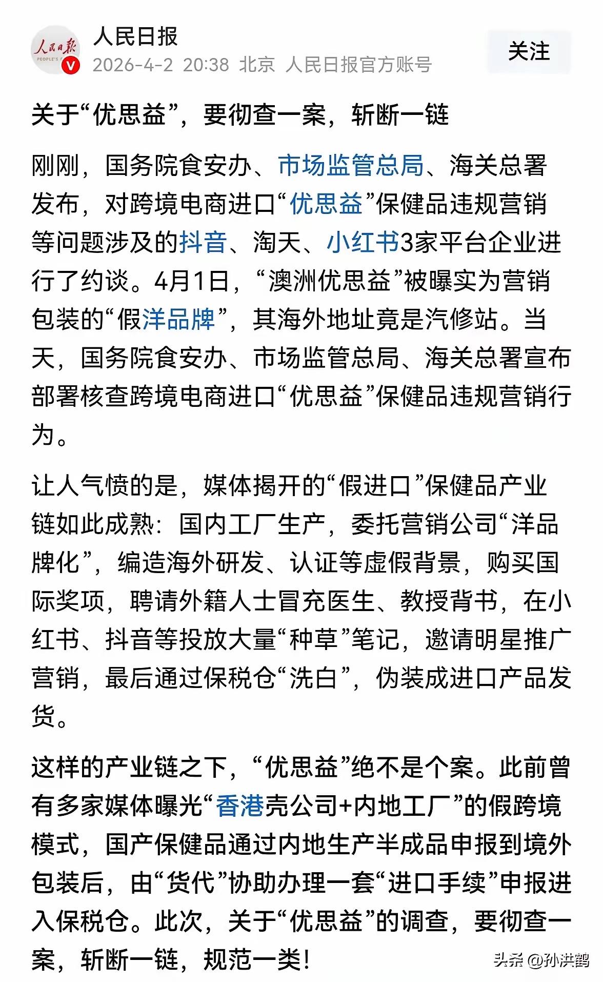 优思益假洋保健品大案发酵,国务院食安办、市场监管总局、海关总署三部门联合严查,公安已介入,直指跨境保健品全产业链造假!直播带货不是法外之地,全链条追责已启动,妄图靠退款脱身绝无可能,违规主播必将付出代价!