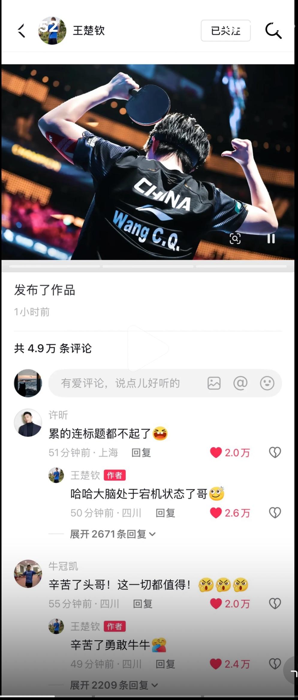 王楚钦与许昕幽默互动啦—哈哈哈😄大脑处于宕机状态了哥! 许昕:累的连标题都不起了! 王楚钦这次总结自己的澳门世界杯 是挺简单的, 怪不得许昕评论, 累的标题都不起了! 宕机状态, 王楚钦也太会形容自己啦, 宕机状态指的是操作系统无法 从一个严重的系统错误中 恢复过来, 或系统硬件层面出现问题, 导致系统长时间无响应, 而不得不重新启动计算机的现象! 王楚钦也太幽默, 太有才,打球厉害👍, 这嘴真的够厉害👍!