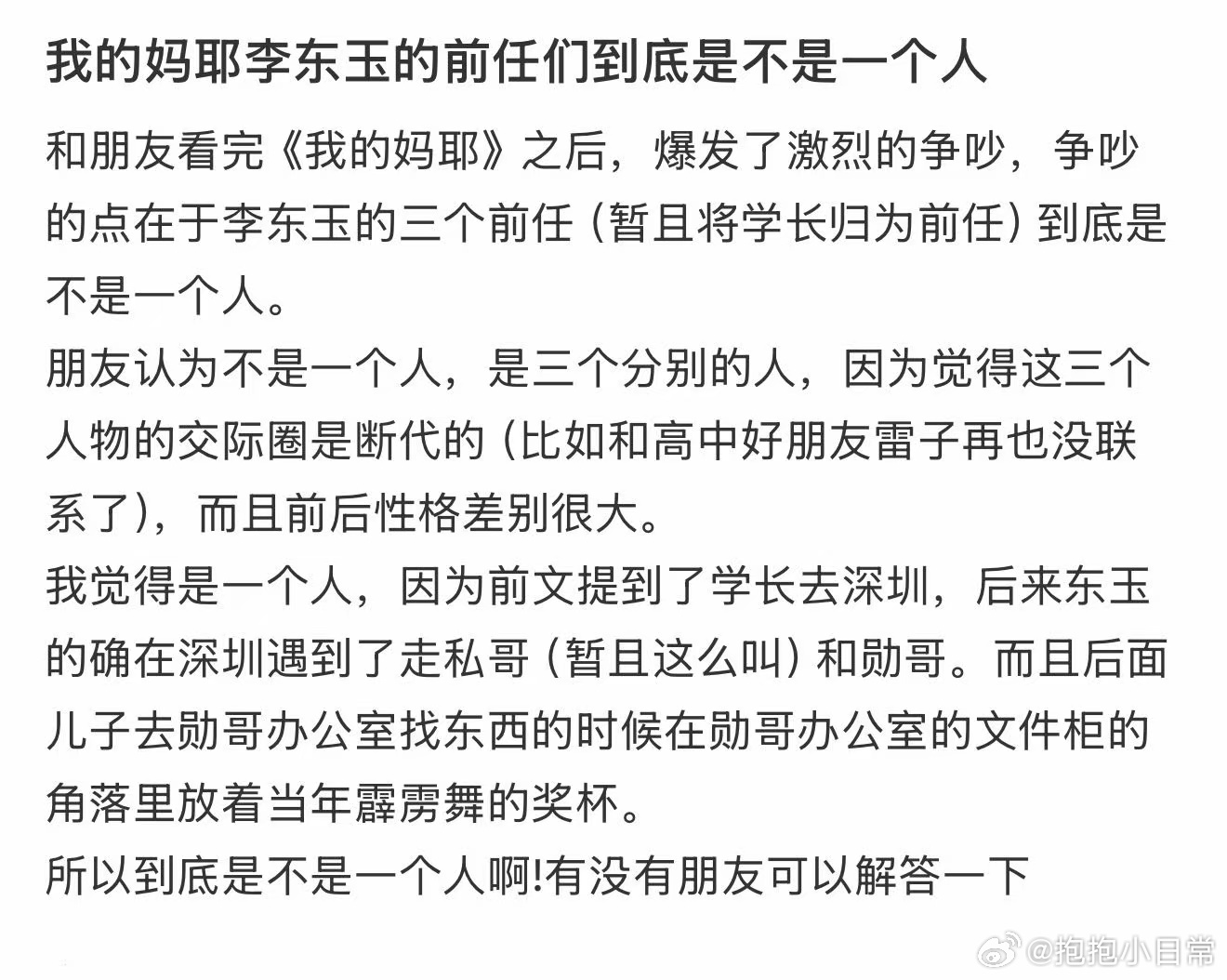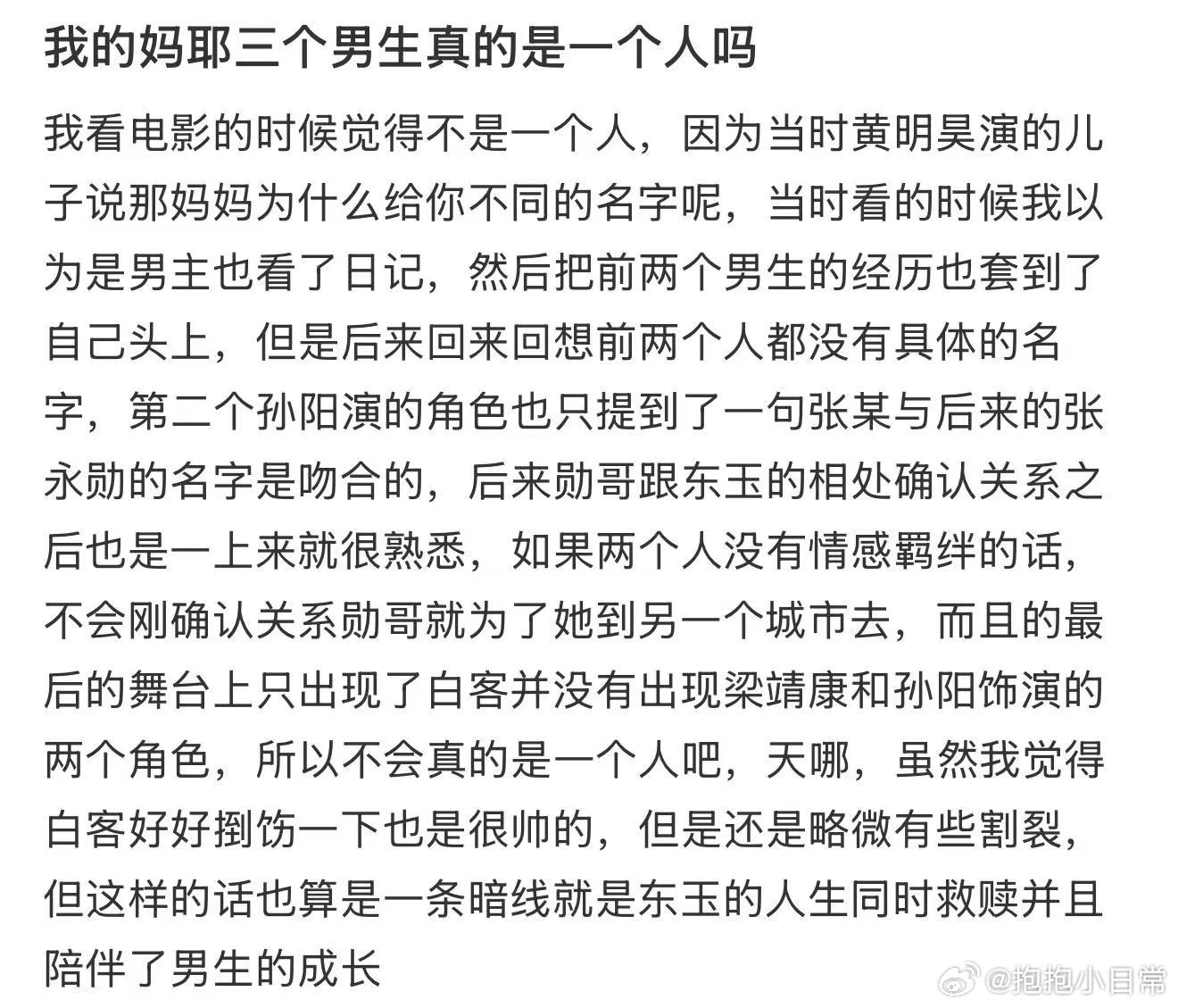 马思纯新片三个男友是同一个人吗 看完《我的妈耶》最大的疑惑:李东玉的三段恋情,到底是和同一个人的不同人生阶段,还是和三个不同人的浪漫邂逅?感觉每个说法都有道理,谁来给我答疑解惑!
