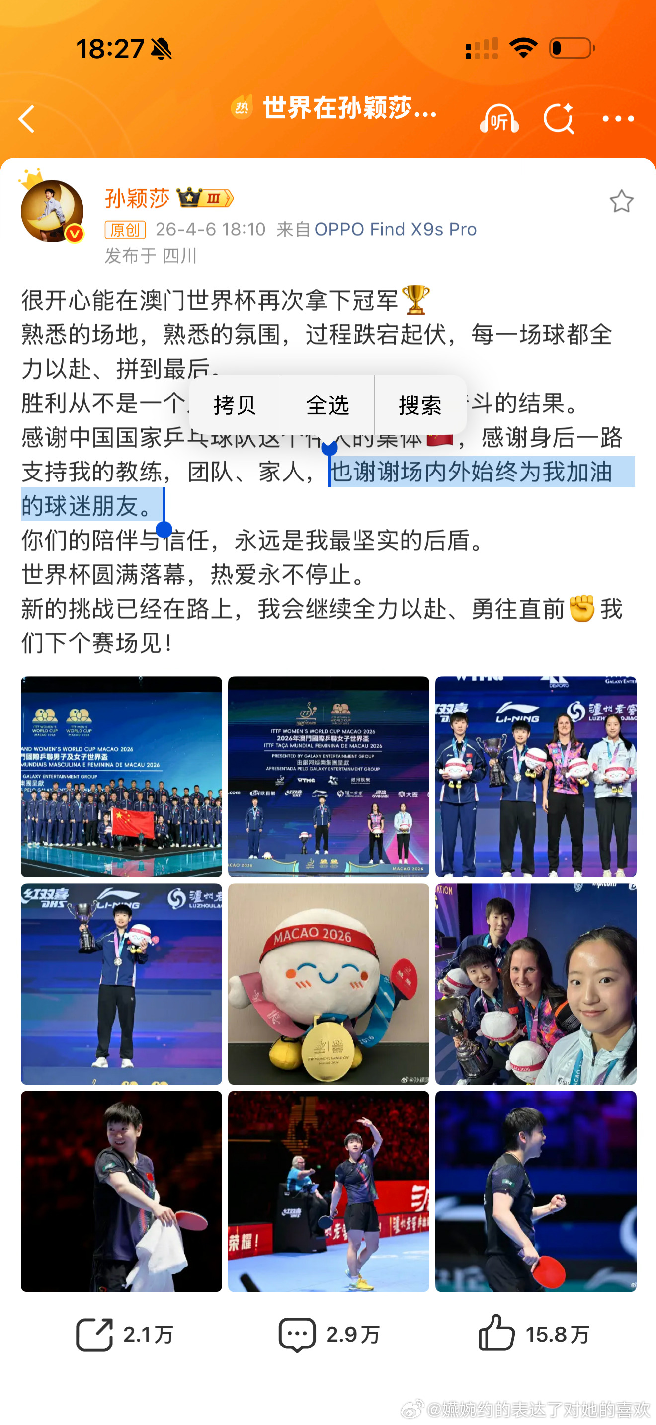 “谢谢场内外始终为我加油的球迷朋友,你们的陪伴与信任,永远是我最坚实的后盾。”是球迷,是朋友,是可以给予信任的人,是相互长久陪伴的人,是坚定的大后方,是最坚实的后盾,孩子真的心里有我们孙颖莎