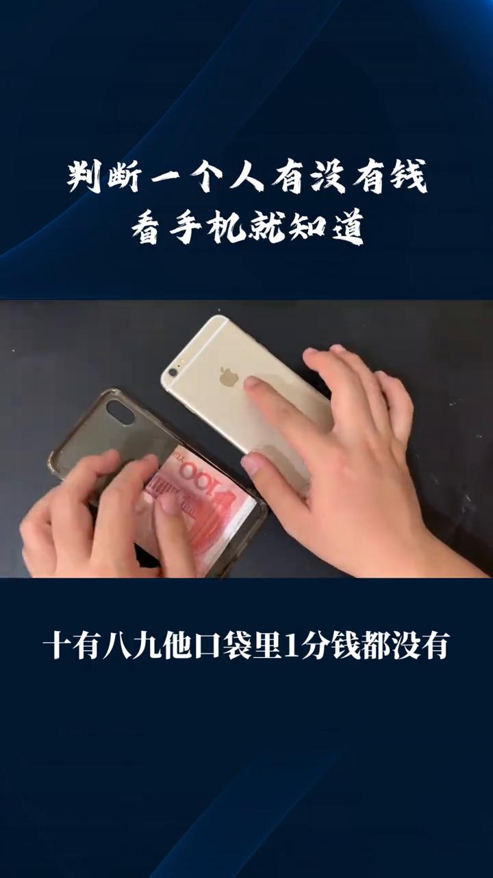 判断一个人有没有钱,就看他用什么手机就知道了。 ·如果他用的是苹果手机,而且是最新款的那一种,十有八九他口袋里一分钱都没有,很有可能这个手机还是贷款分期买的。 ·如果他用的是两三千国产手机,而且手机壳还发黄,十有八九他口袋里还有三四十万的存款。