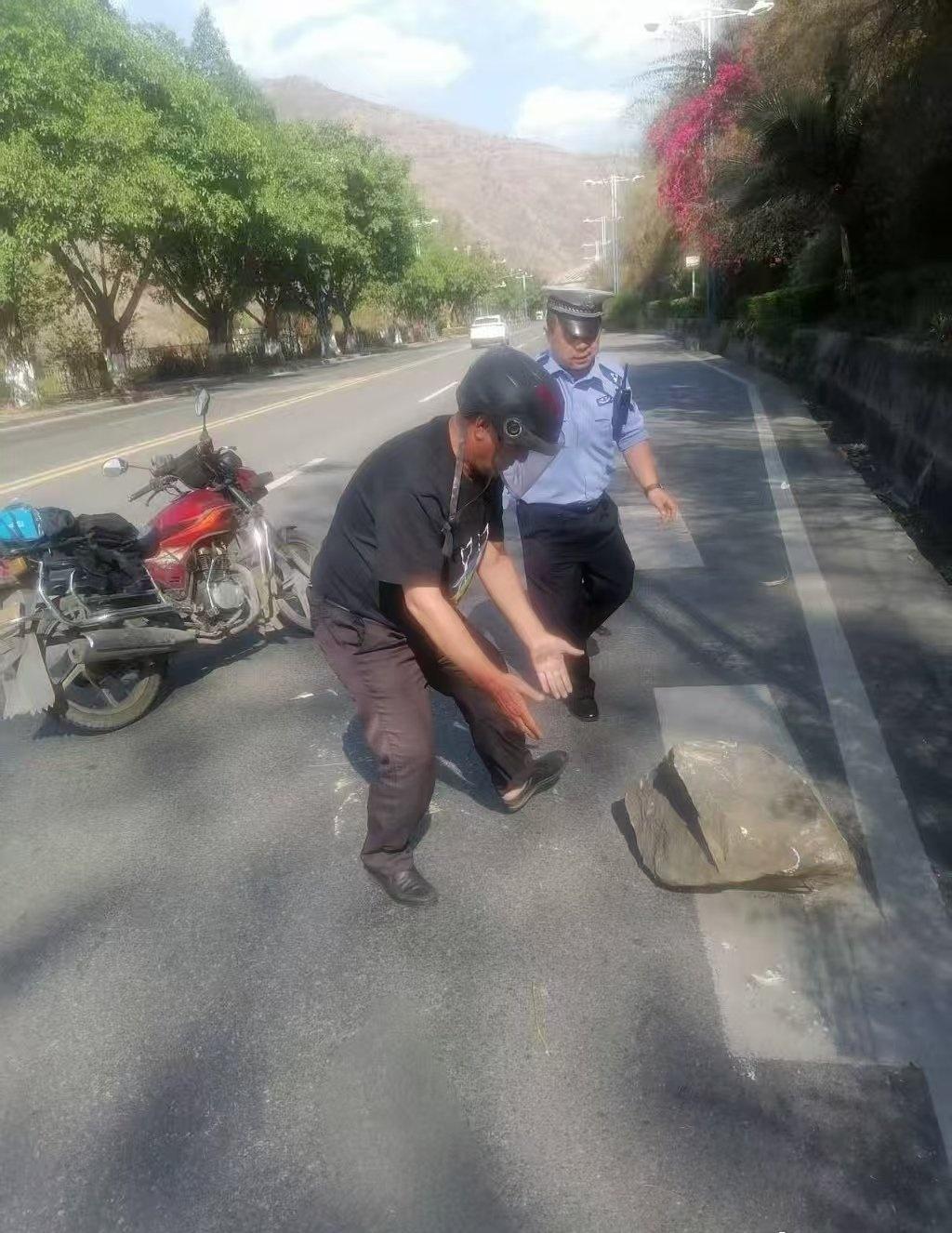 4月6日,交警三大队辖区青龙山路段存在落石,严重影响行车安全。执勤民辅警发现险情后,迅速联合热心群众,合力将落石移至路边,及时消除隐患。