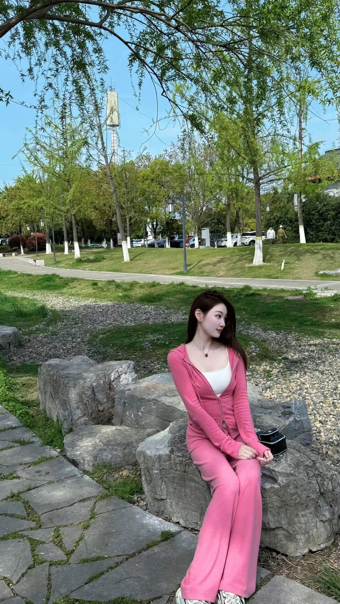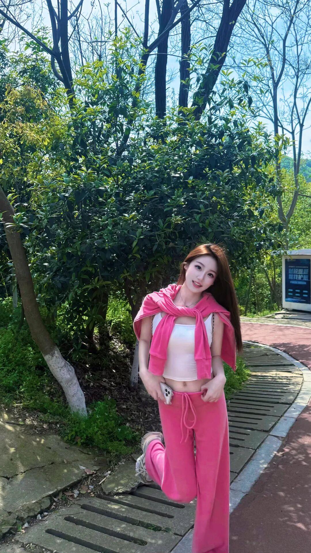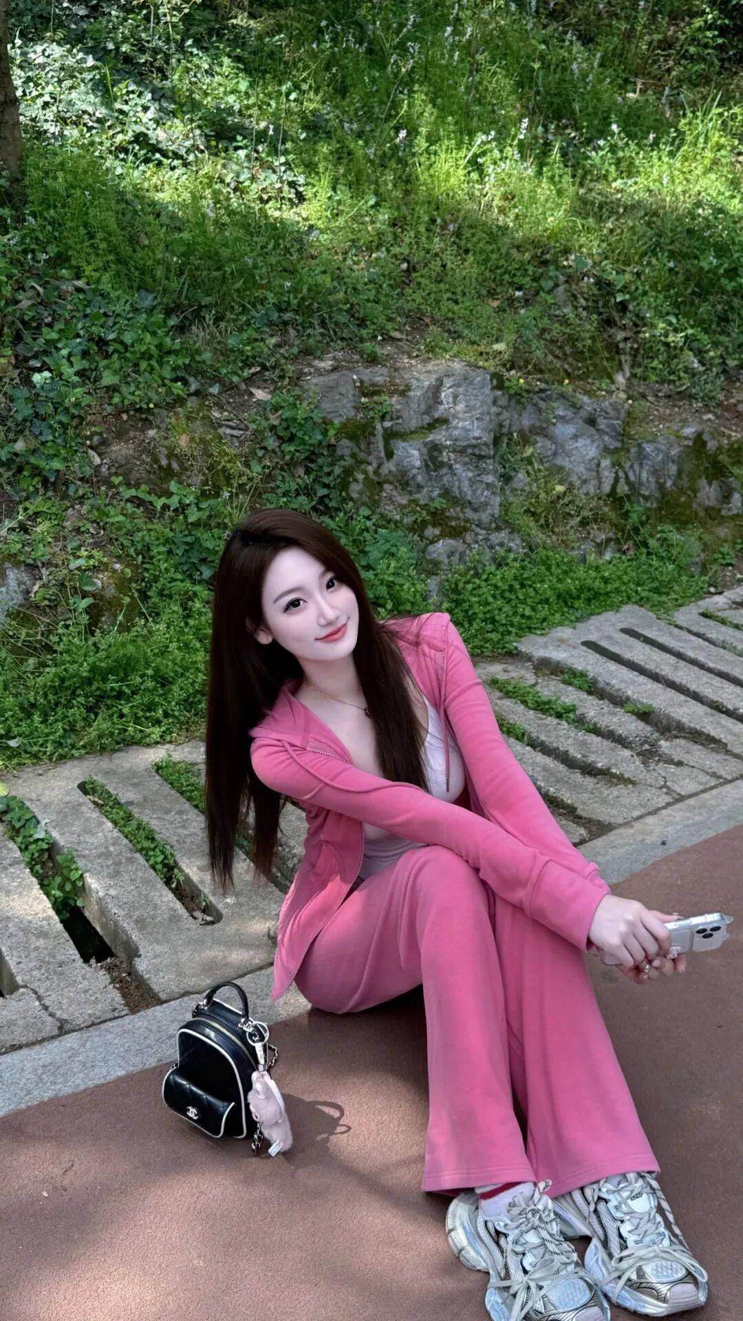 她身着一套玫粉色的休闲运动套装,搭配白色内搭,色彩明艳又元气。一头乌黑的长直发垂顺飘逸,衬得肌肤白皙,五官精致灵动。
