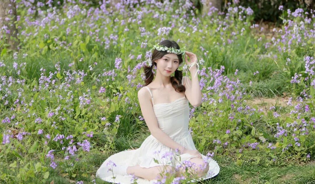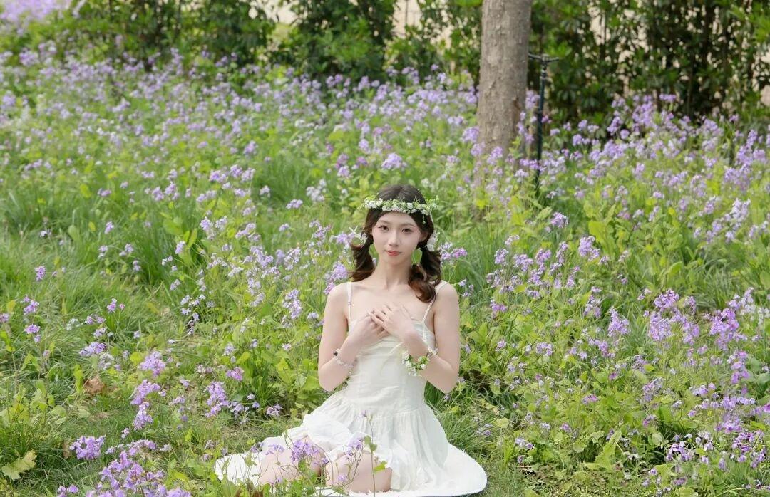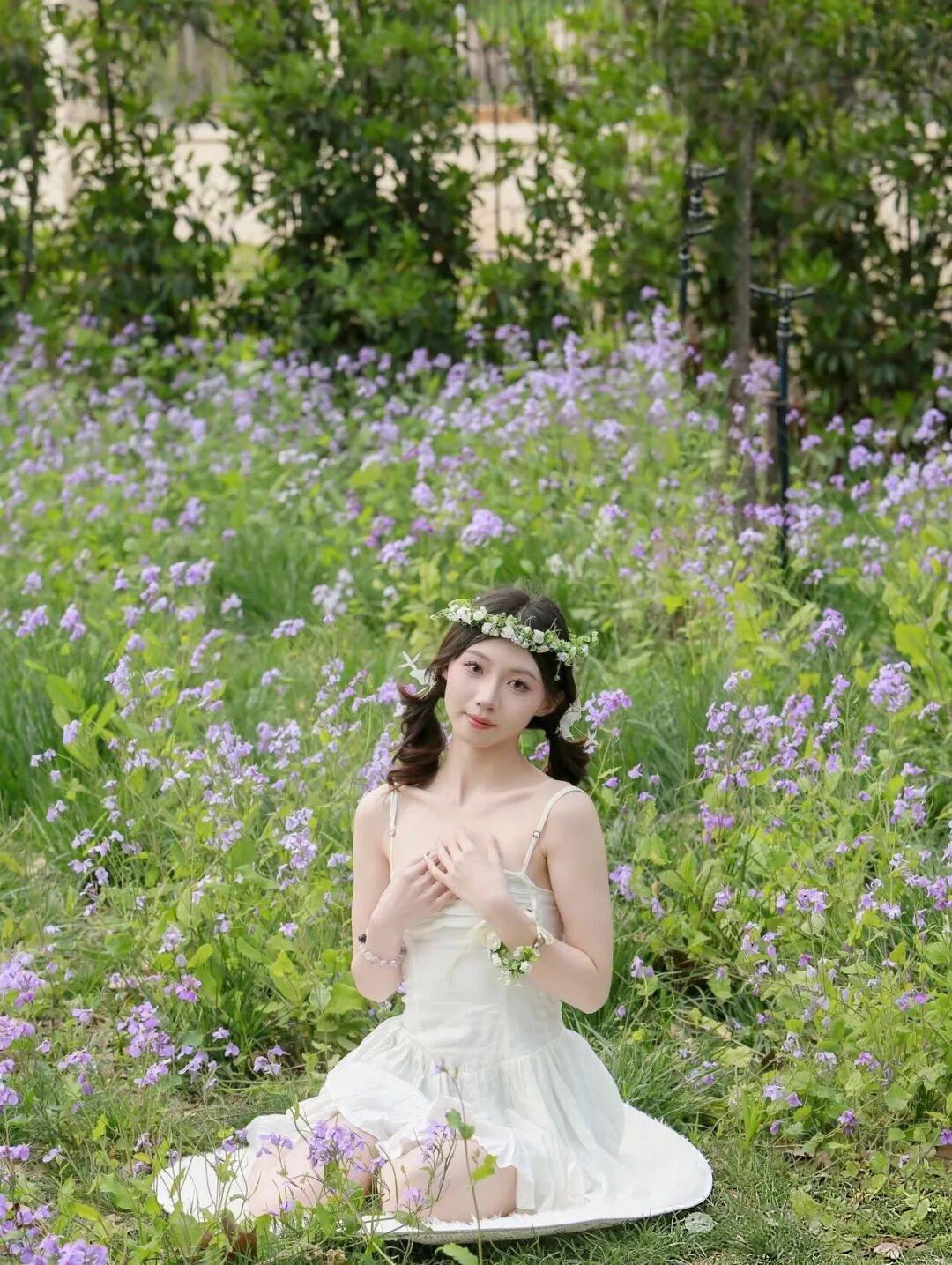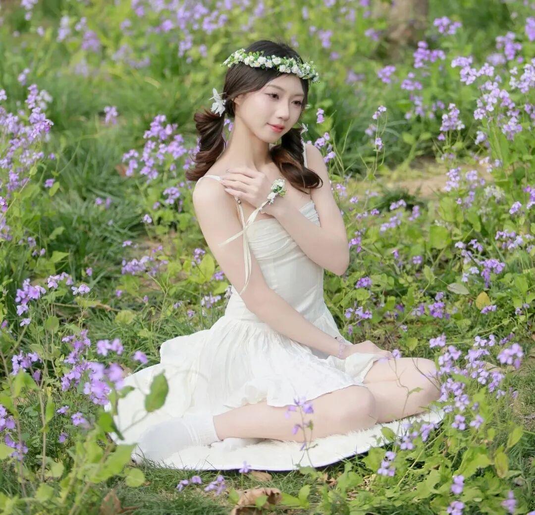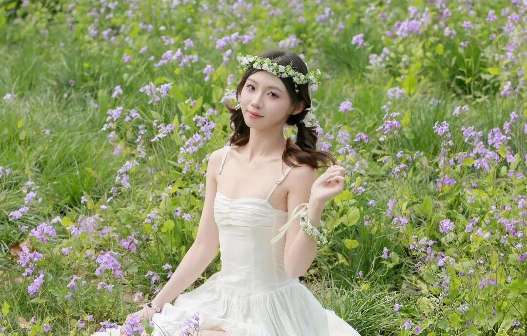 她身着一袭纯白吊带纱裙,轻盈的裙摆如云朵般铺散在草地上,简约的设计勾勒出纤细优美的身姿,尽显清纯与灵动。乌黑的长发梳成俏皮的双马尾,头上戴着亲手编织的绿叶花环,腕间缠绕着同色系花饰,与周围的花海融为一体,宛若误入人间的森林精灵。