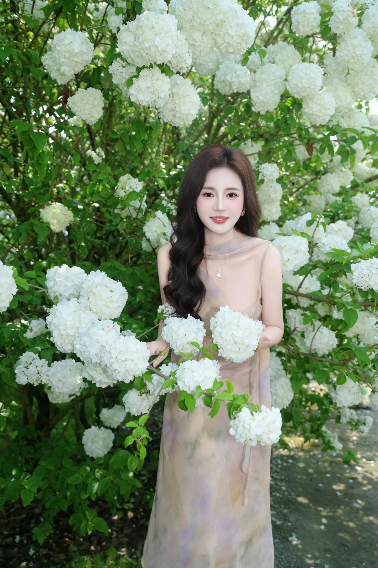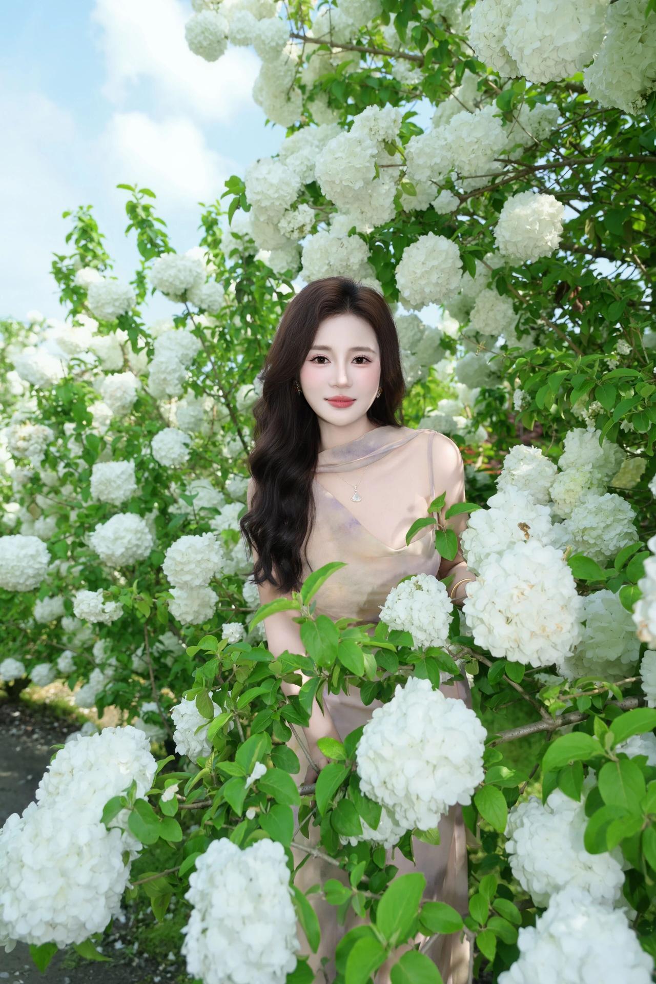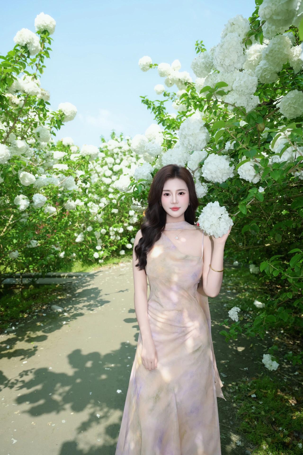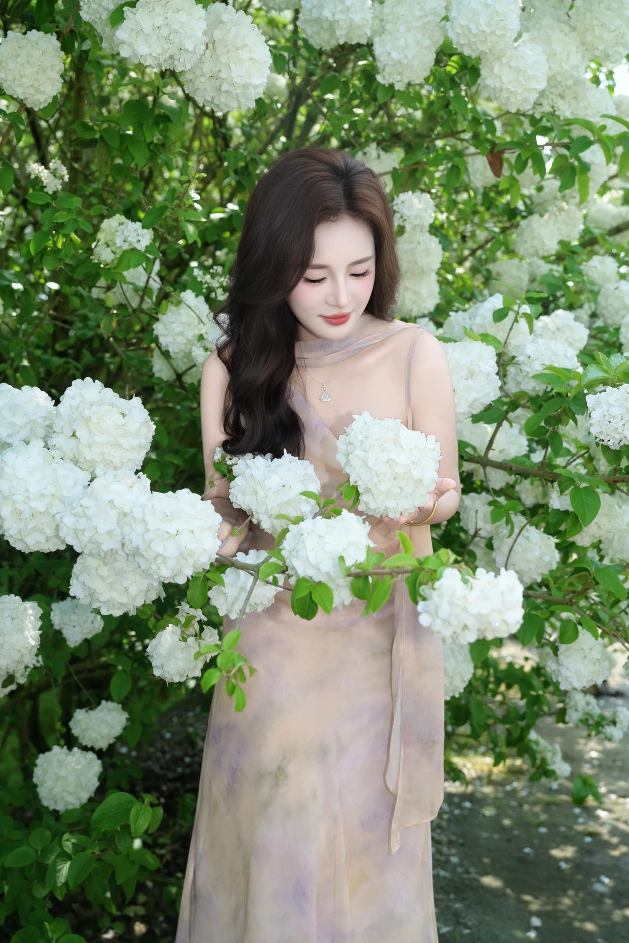 明媚的春光透过绿叶洒下,洁白的花团簇拥着她,人与花相互映衬,清新脱俗,每一帧都定格了春日里独有的浪漫与诗意。