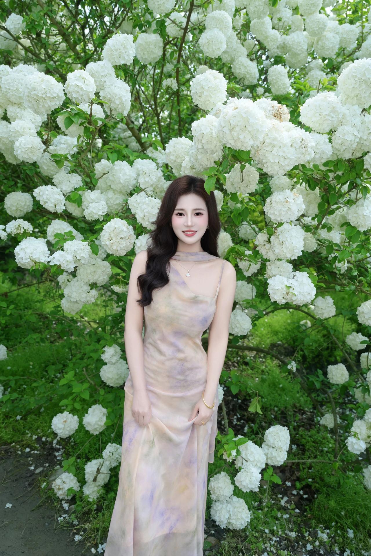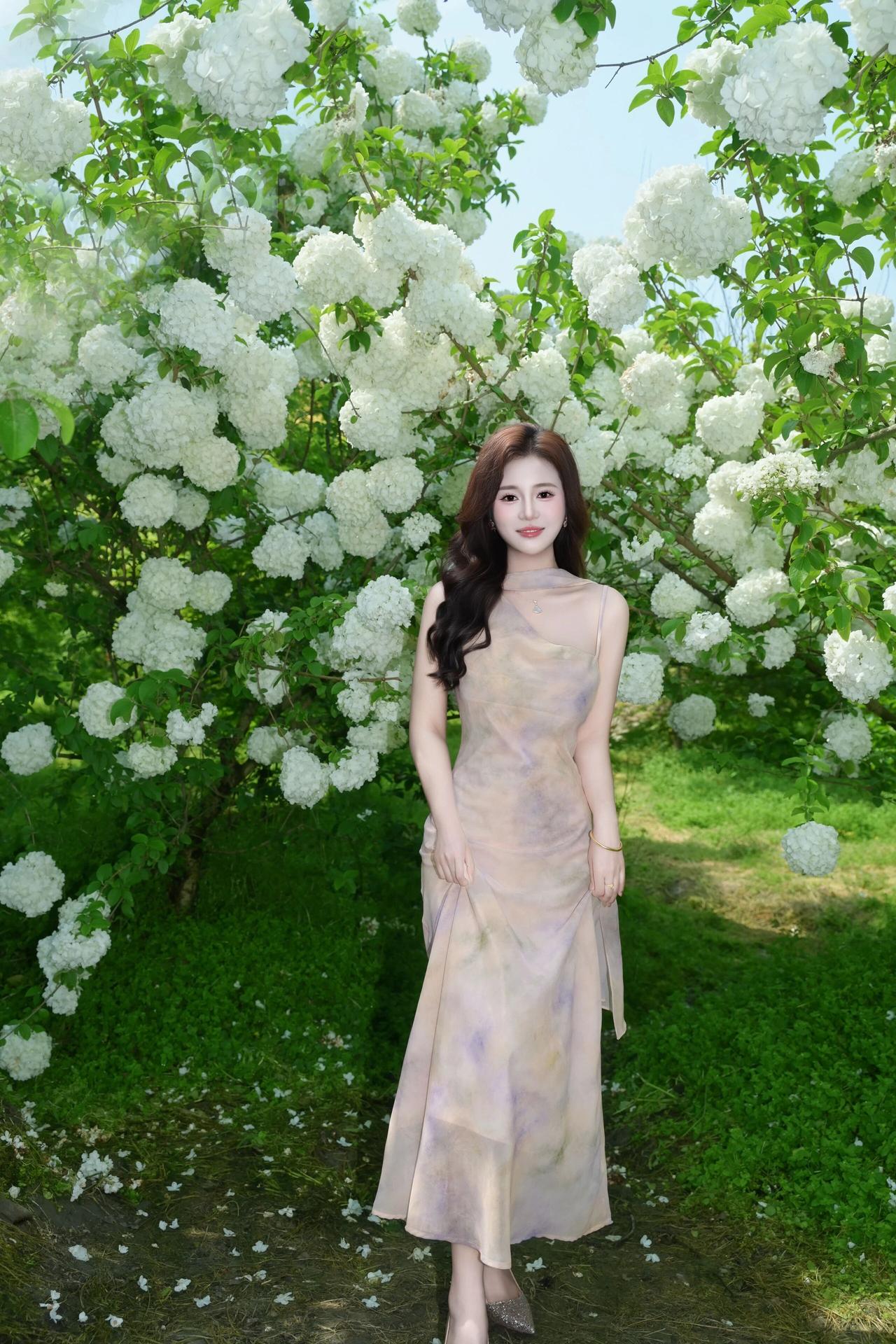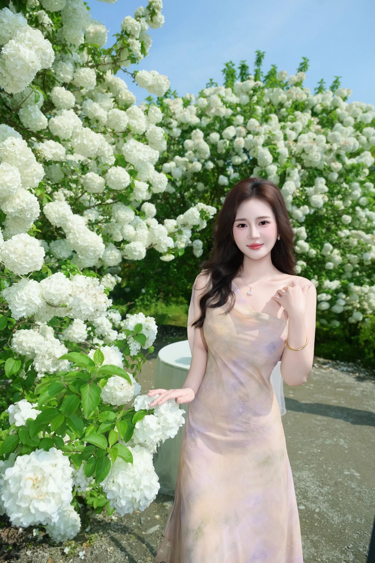 明媚的春光透过绿叶洒下,洁白的花团簇拥着她,人与花相互映衬,清新脱俗,每一帧都定格了春日里独有的浪漫与诗意。