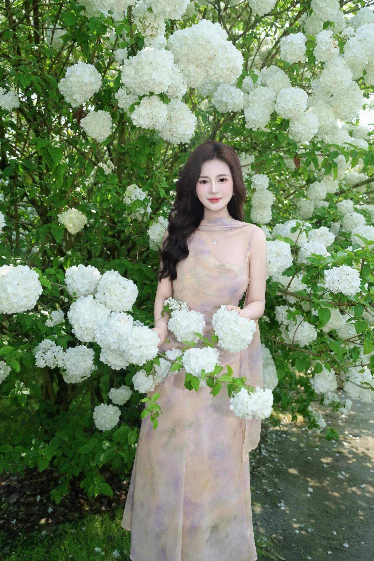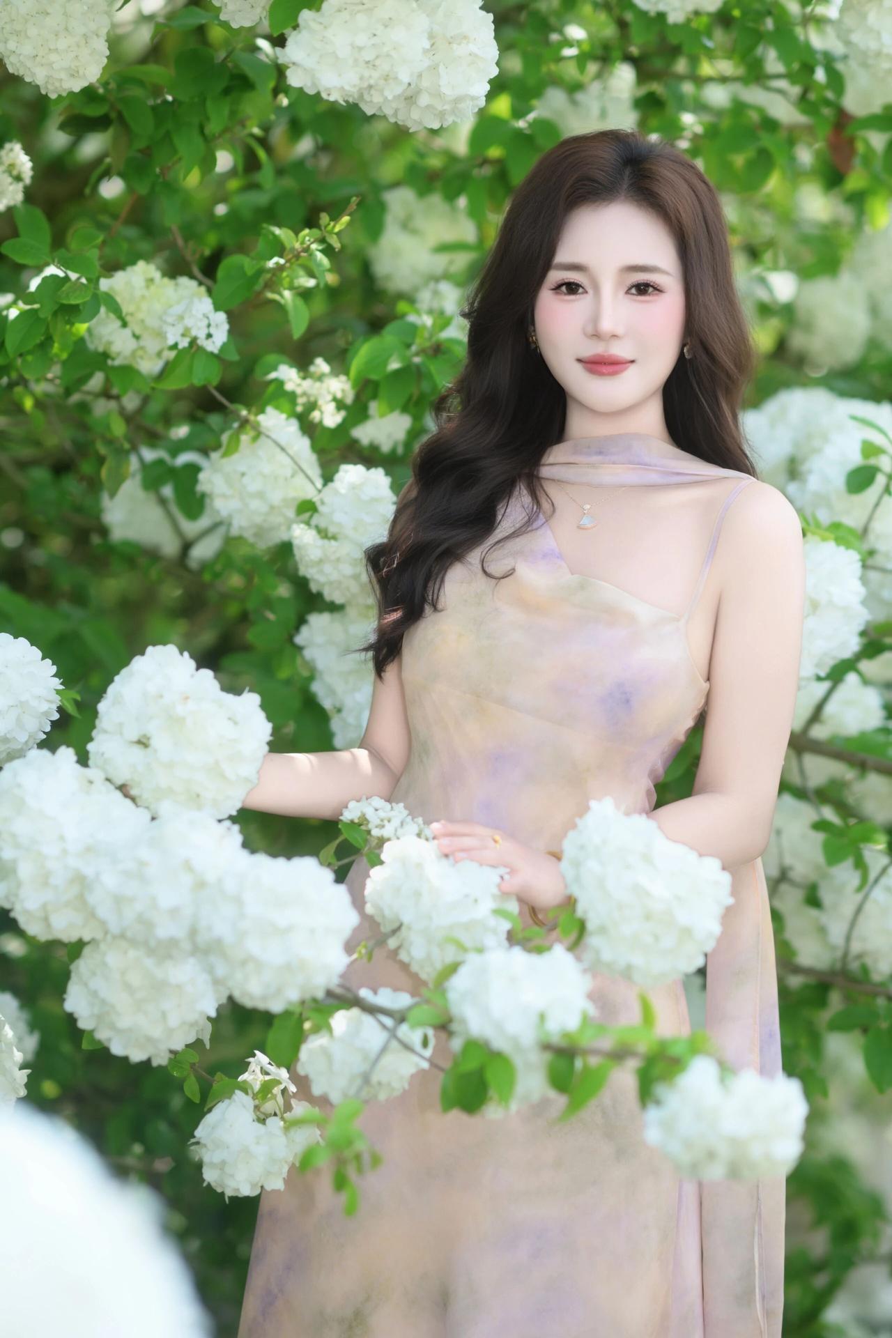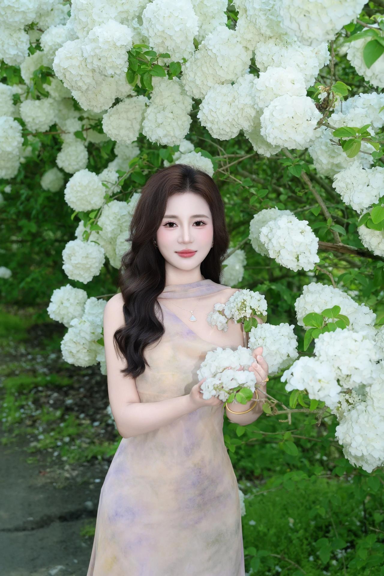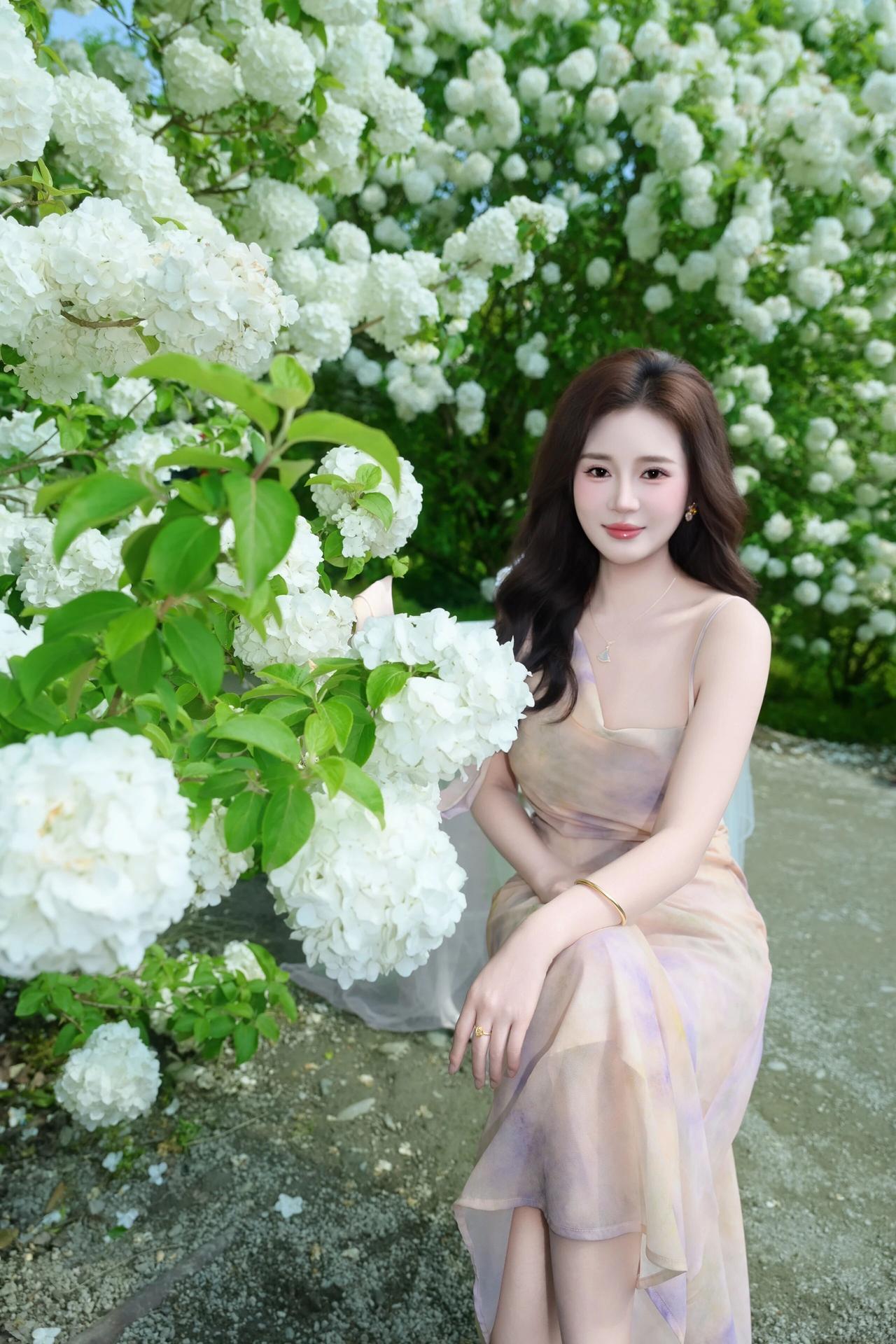 明媚的春光透过绿叶洒下,洁白的花团簇拥着她,人与花相互映衬,清新脱俗,每一帧都定格了春日里独有的浪漫与诗意。