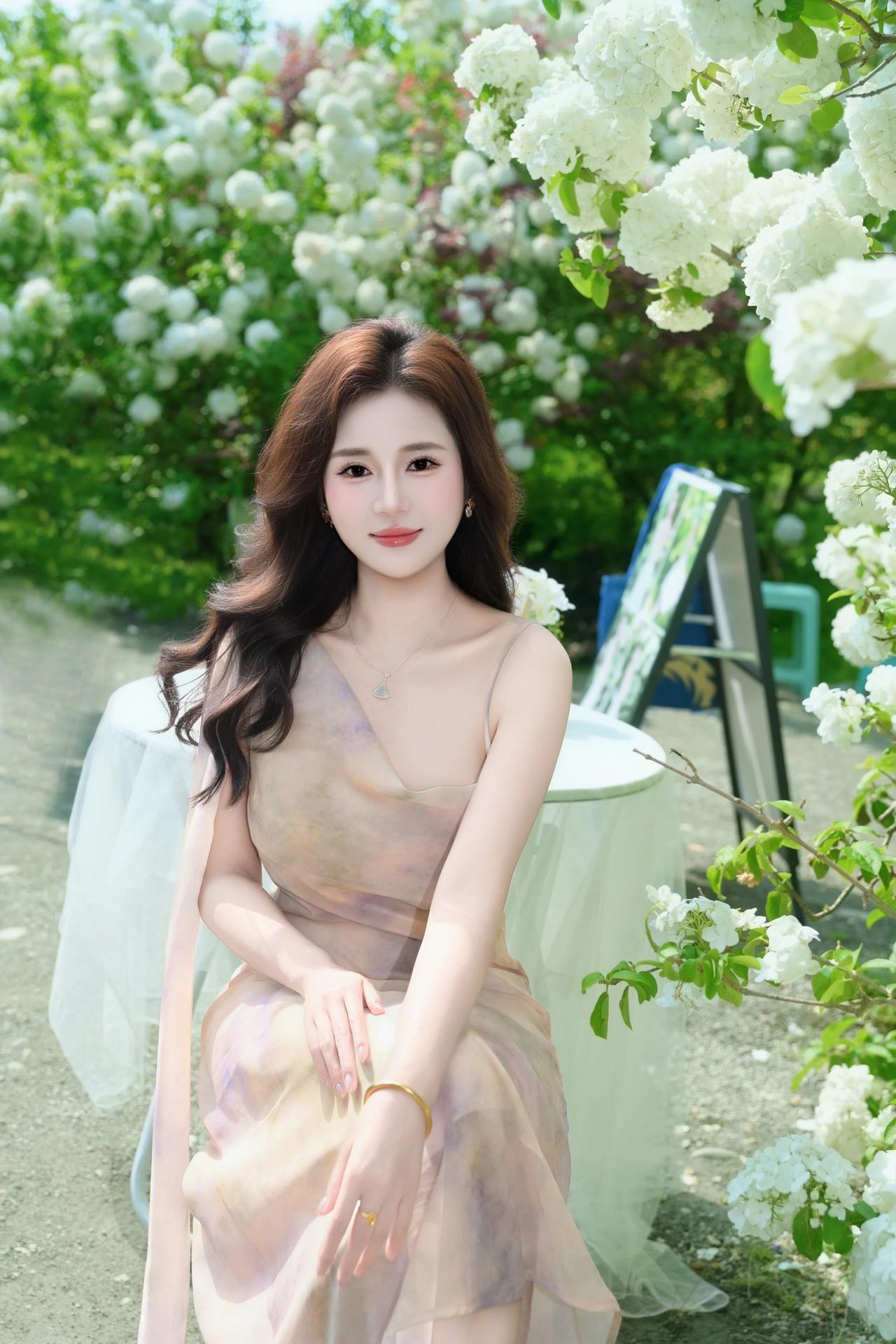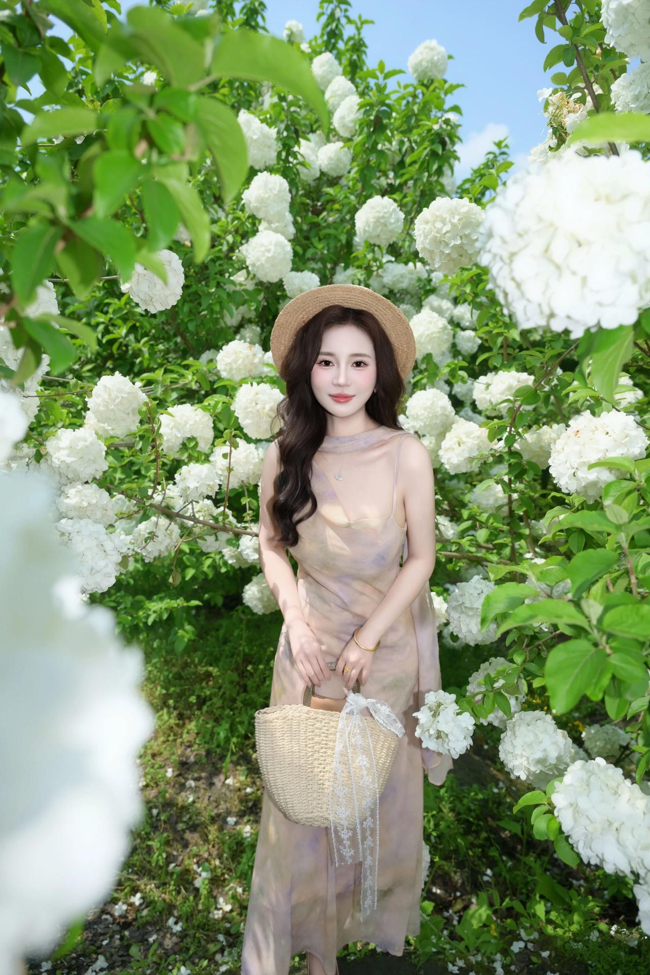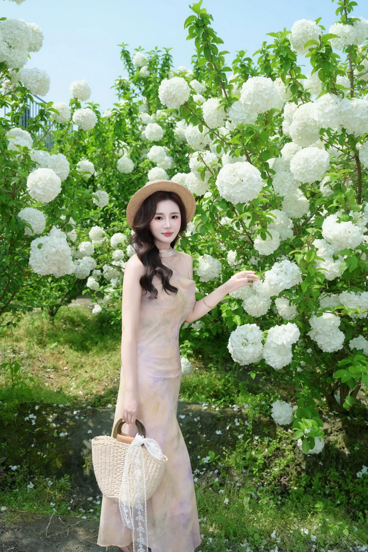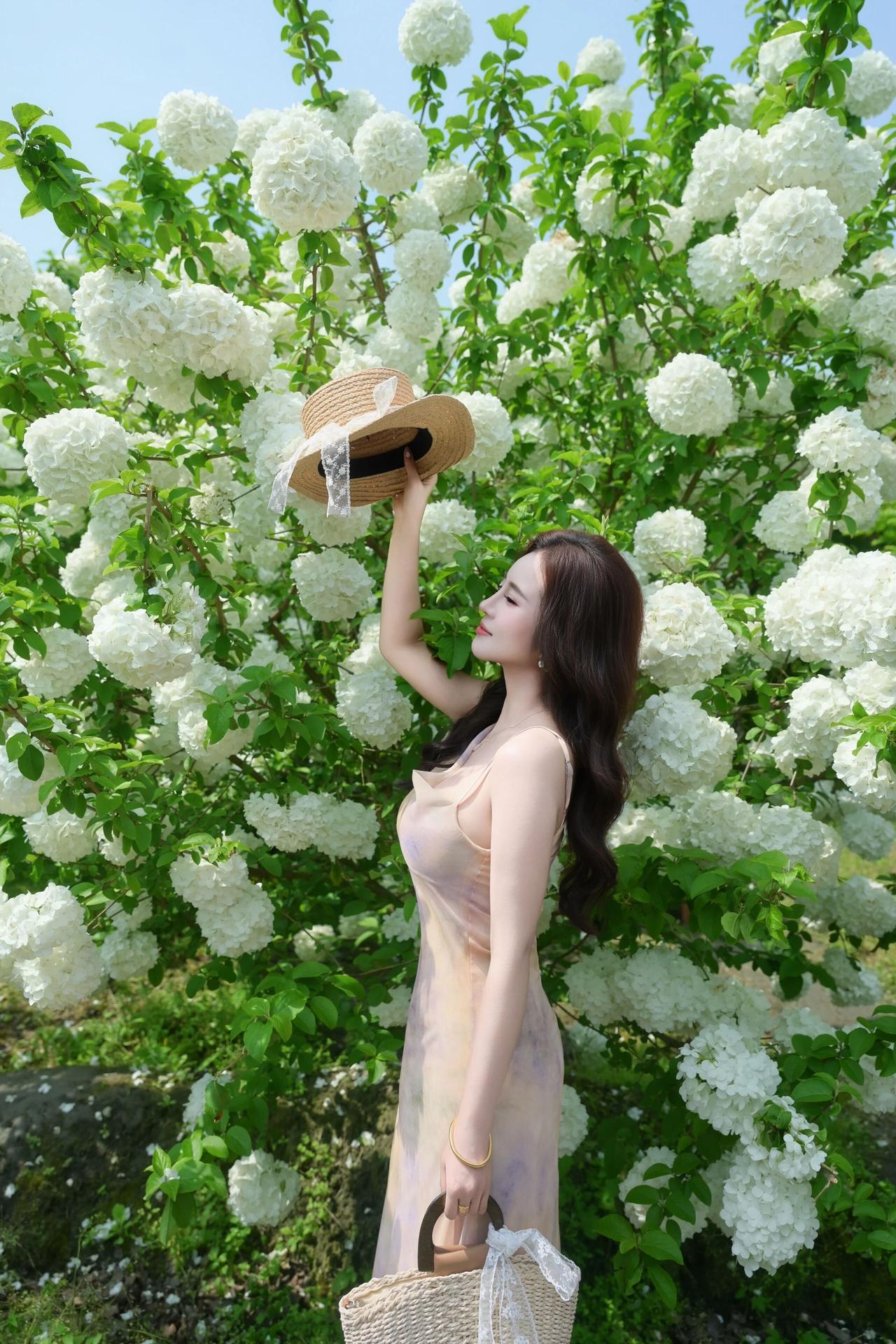 她时而轻拈花枝,与满簇的白花相映成趣;时而抬手轻扶草帽,侧颜线条流畅优美;时而静立花间,垂眸浅笑,氛围感拉满。