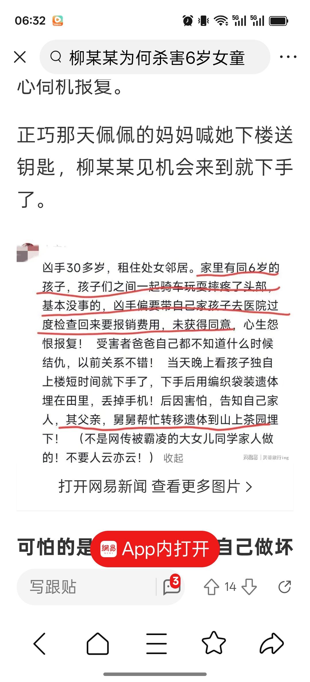 是什么让她下此毒手? 安徽岳西6岁小女孩失踪案已经告破,凶手柳某某已被抓获,可惜女孩已经被她杀害。 两家都租住在镇上的同一栋楼里,柳某某家住二楼,失踪女孩家住三楼,可以说是非常近的邻居了。柳某某也有个孩子6岁左右,两个孩子还是不错的朋友。 至于柳某某为什么如此心狠手辣,有知情人透露了一个消息,那就是两个孩子一起玩耍时,柳某某的孩子受伤了。柳某某去医院检查,花了一些费用,向对方主张赔偿。结果对方家长没有理她,她就怀恨在心,一直寻找机会报复。 说起来这个柳某某够狠的,她亲手掐死女孩后,抛尸在水沟里。作为一介女流,能下此狠手,真是凶残!我作为一个五十多岁的老爷们,至今不敢杀鸡,这个柳某某却亲手扼杀了一个小生命。