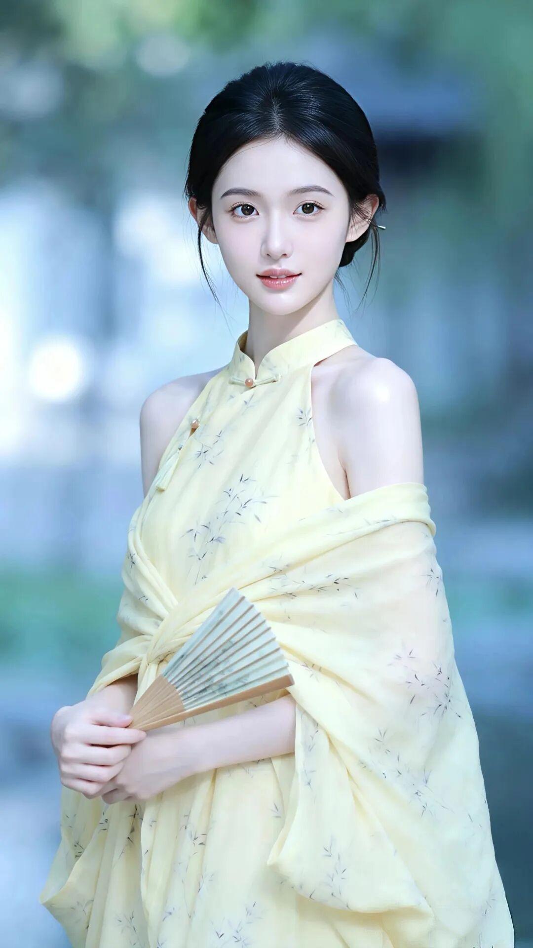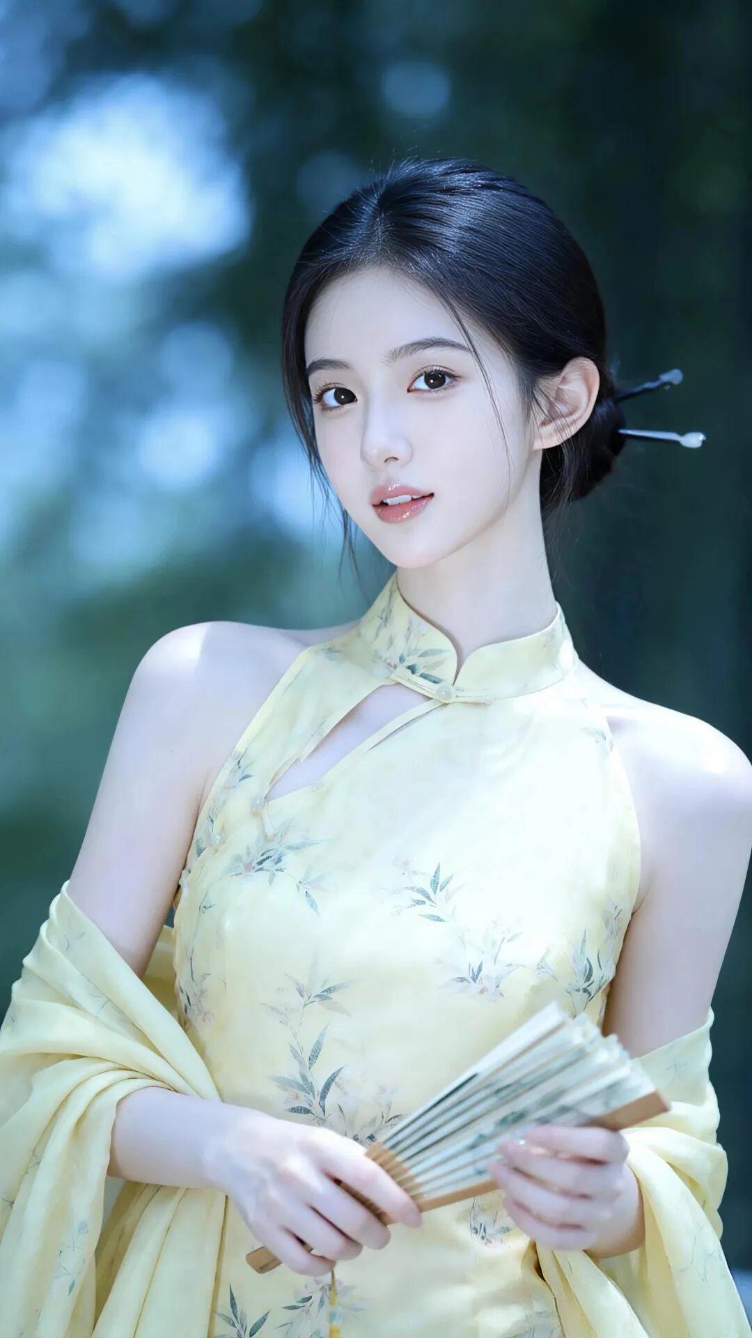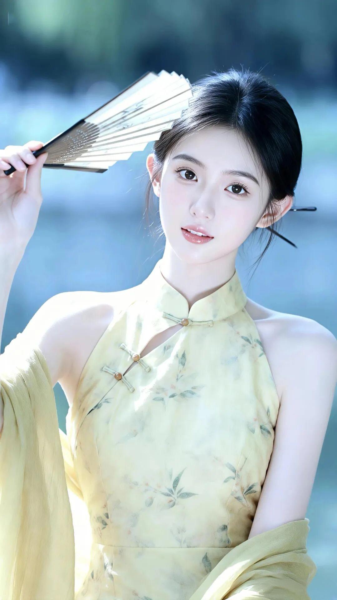鹅黄色的旗袍面料轻盈飘逸,上面点缀着淡雅的竹叶暗纹,清新脱俗。挂脖设计勾勒出优美肩线,外搭同色系薄纱披肩,随风轻扬,仙气十足。她手持一把素色折扇,或轻握于胸前,或半遮于发间,姿态万千,一颦一笑皆是风情。