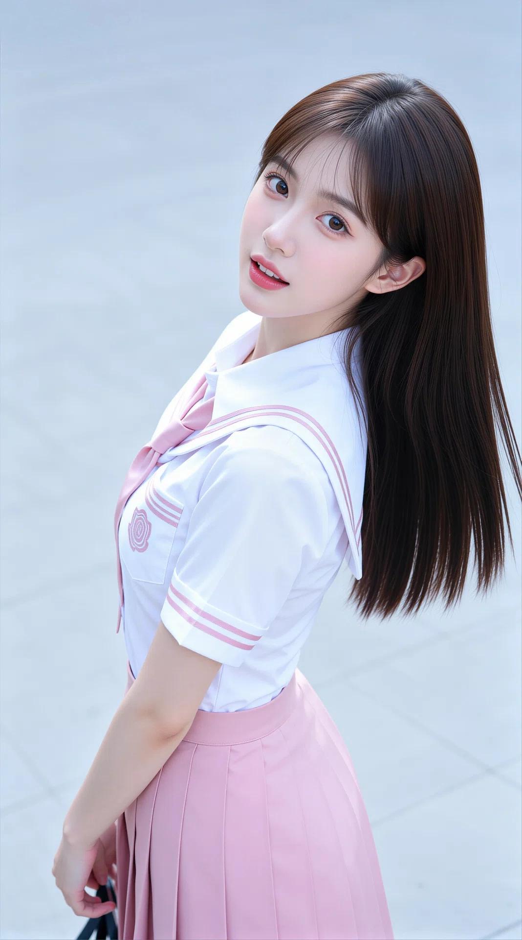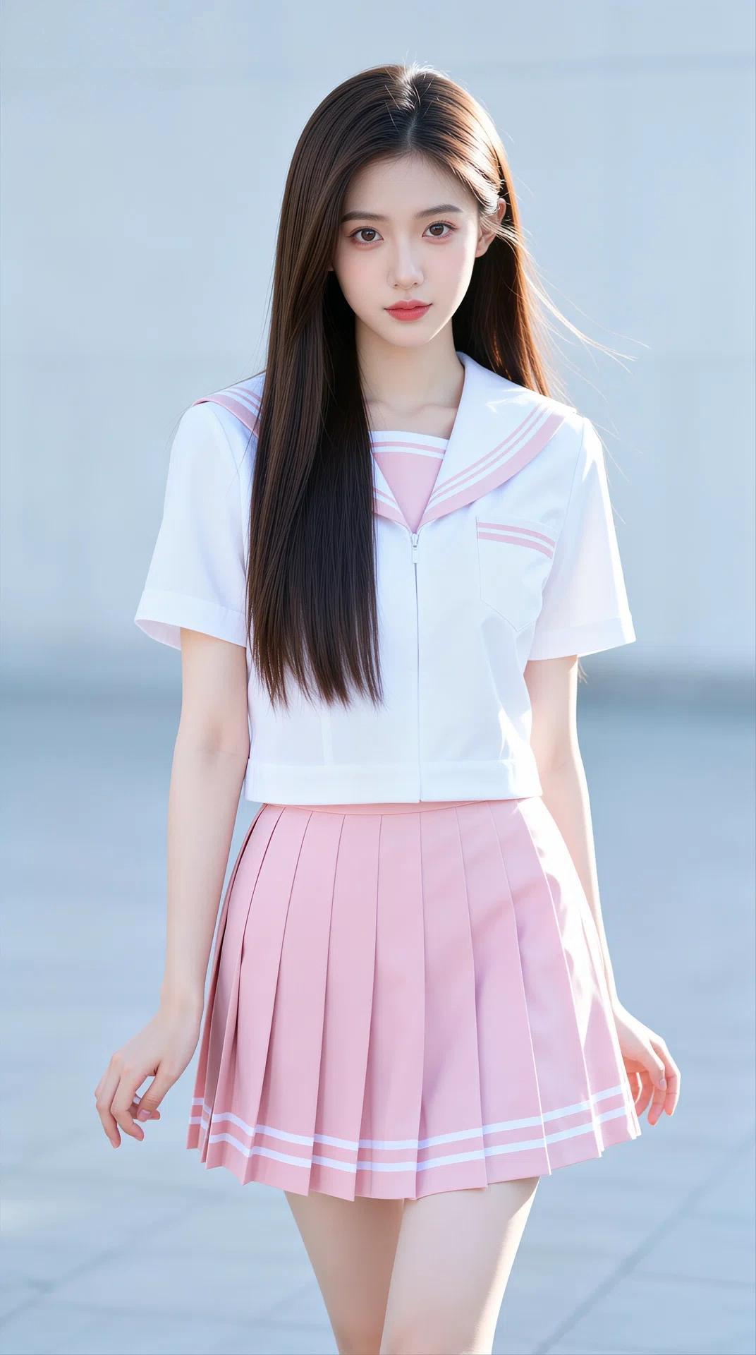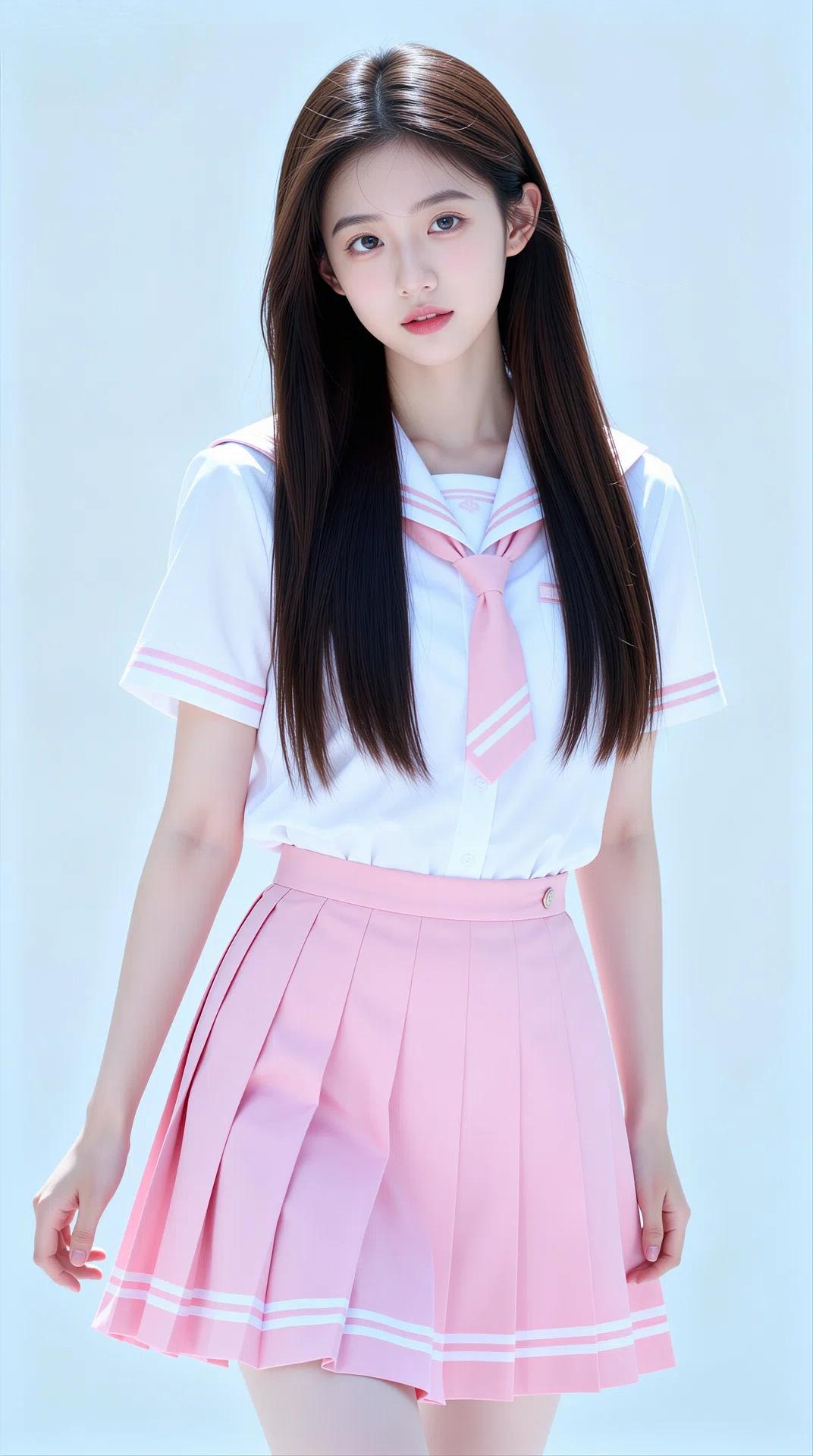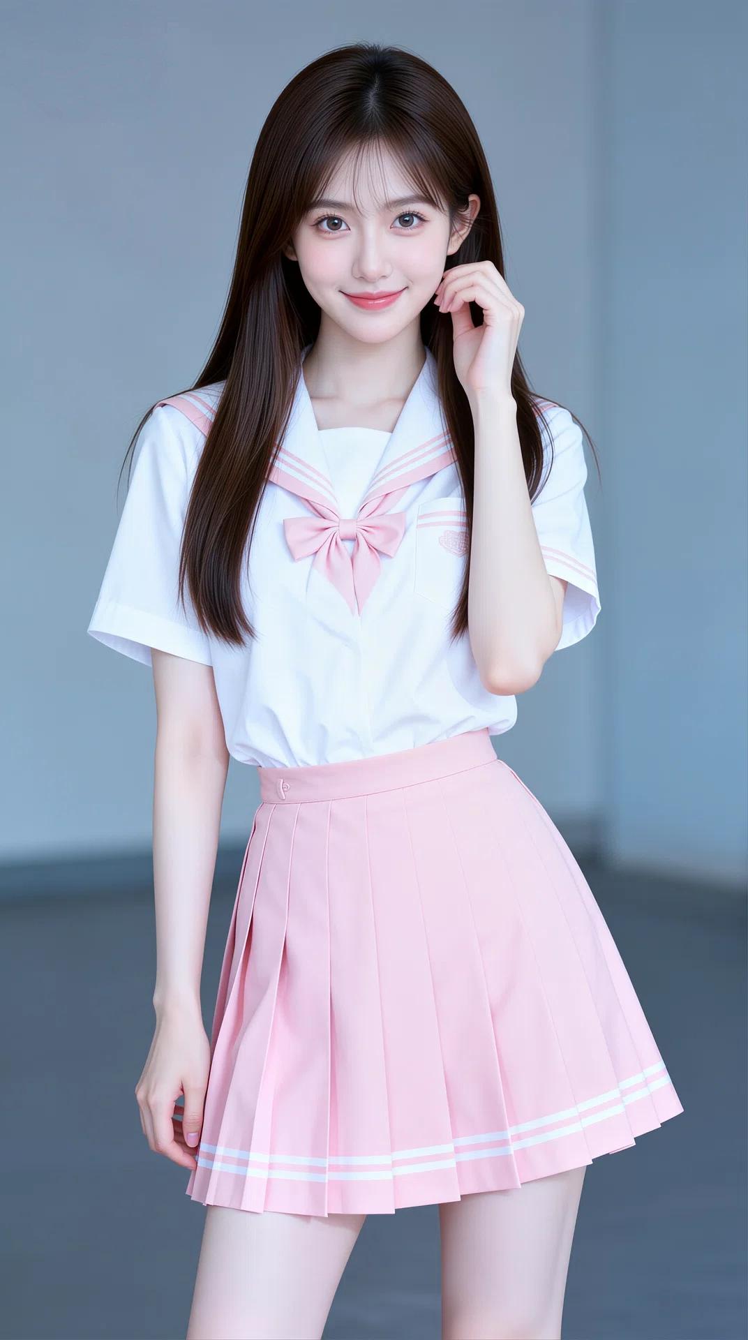 她拥有一头乌黑柔顺的长直发,搭配空气刘海,眉眼清澈灵动,肌肤白皙,笑容甜美治愈。身穿白色水手服上衣,领口与袖口点缀着粉色线条,搭配同色系粉色领结/领带,下身是粉色百褶短裙,裙摆飘逸,尽显少女的娇俏与活力。整体穿搭清新减龄,将少女的清纯、灵动与娇憨展现得淋漓尽致。