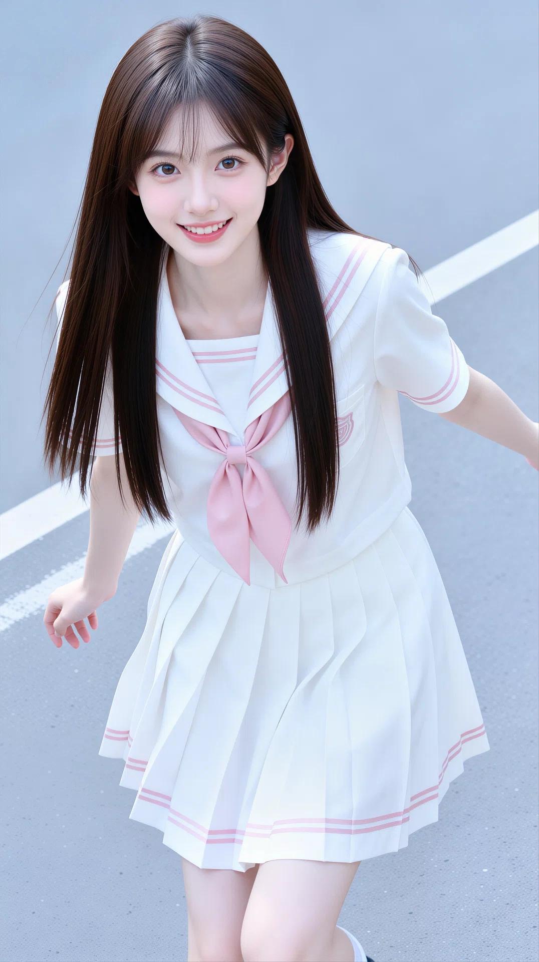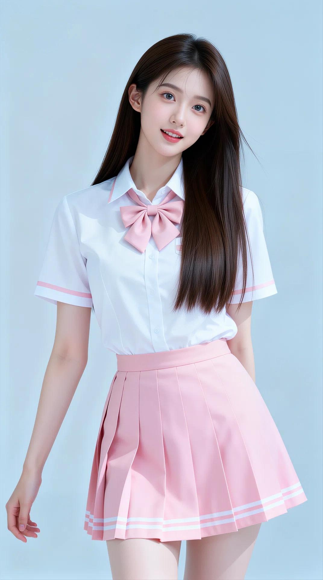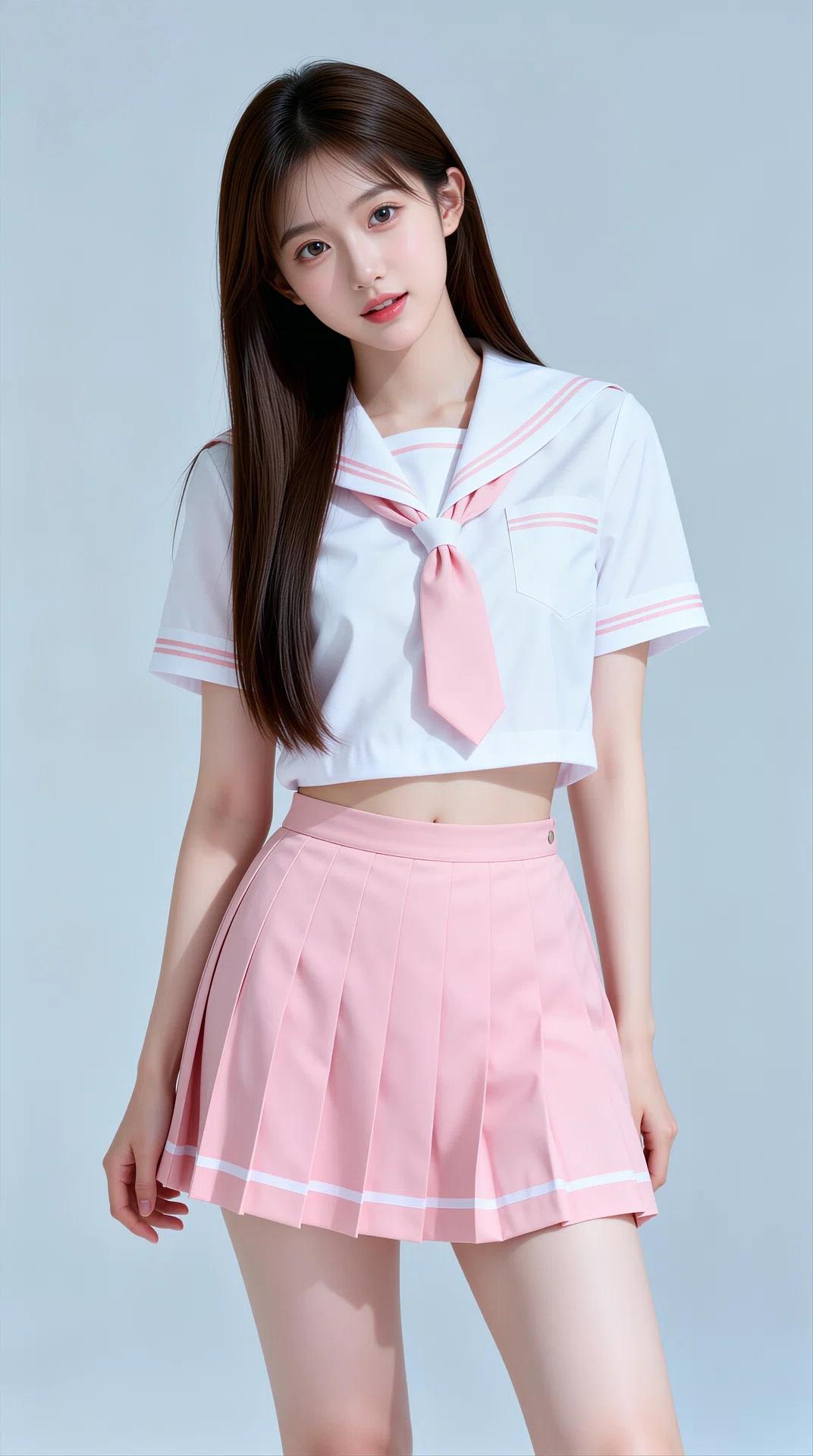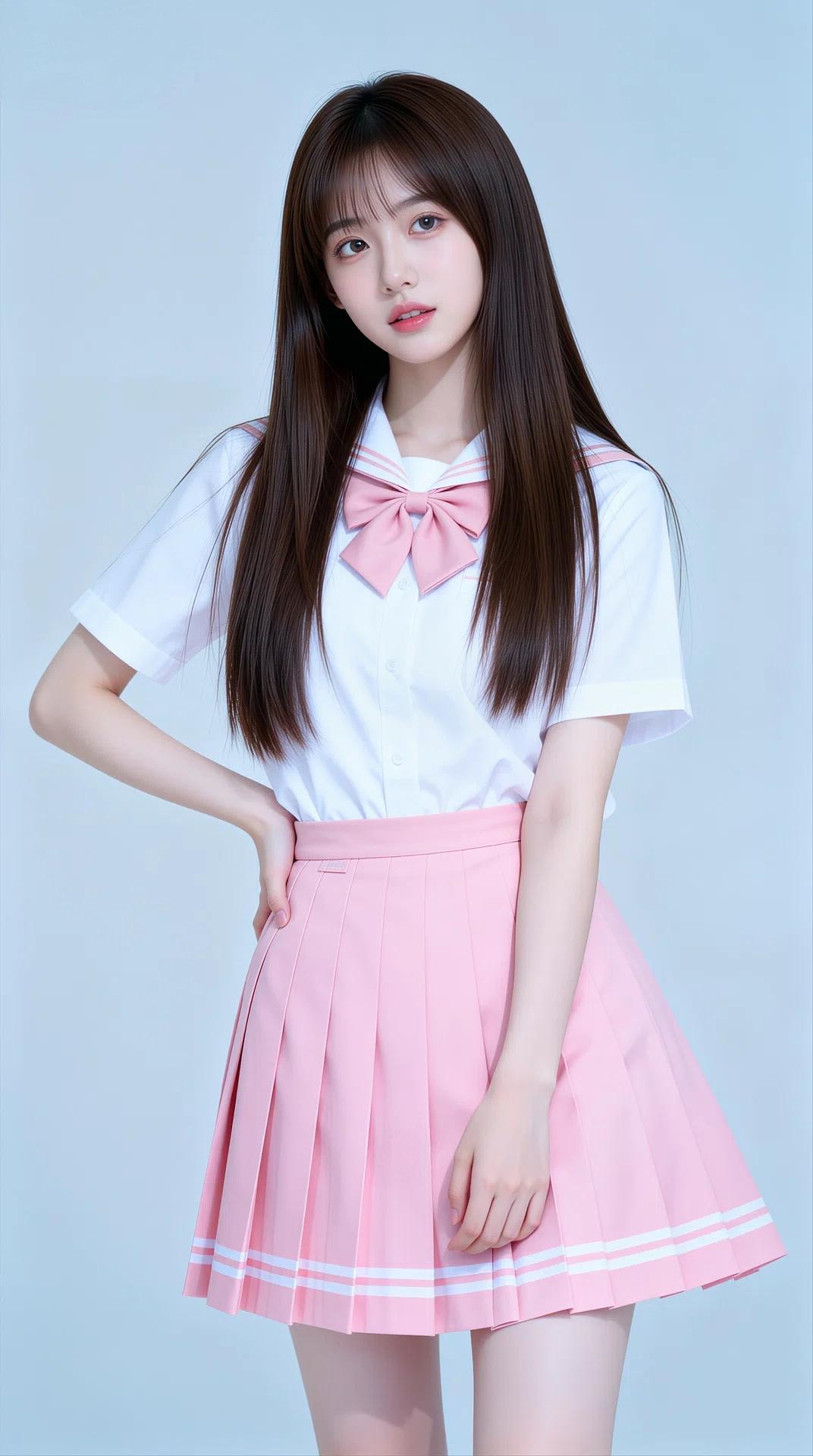 她拥有一头乌黑柔顺的长直发,搭配空气刘海,眉眼清澈灵动,肌肤白皙,笑容甜美治愈。身穿白色水手服上衣,领口与袖口点缀着粉色线条,搭配同色系粉色领结/领带,下身是粉色百褶短裙,裙摆飘逸,尽显少女的娇俏与活力。整体穿搭清新减龄,将少女的清纯、灵动与娇憨展现得淋漓尽致。