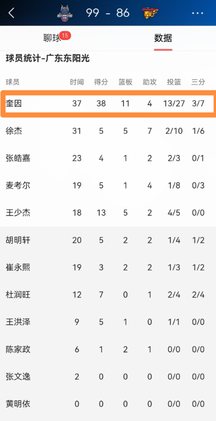 广东东阳光外援奎因真是恨死徐杰了!在今天广东东阳光客场以86:99不敌山东高速的比赛中,虽然火力全开的奎因爆砍38分,但是由于徐杰的拉胯,导致奎因的精彩表现化为了泡影。 整场比赛下来,奎因首发出战37分钟,投篮27中13,其中三分球7中3、罚球10中9空砍38分,外加11篮板4助攻2抢断,不过有8次失误。 在比赛结束以后,当奎因看到队友徐杰的数据统计时,我相信奎因一定恨死表现拉胯的徐杰了。