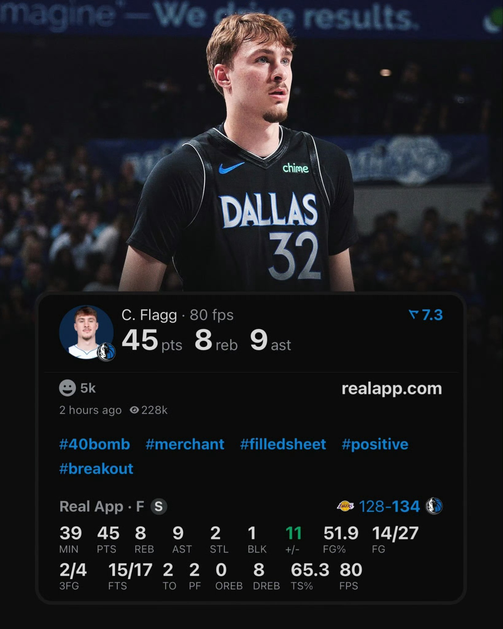 19岁的弗拉格最近的表现非常炸裂,大概率是今年的最佳新秀,45分8篮板9助攻,同样为联盟出现这样的新人欢呼!