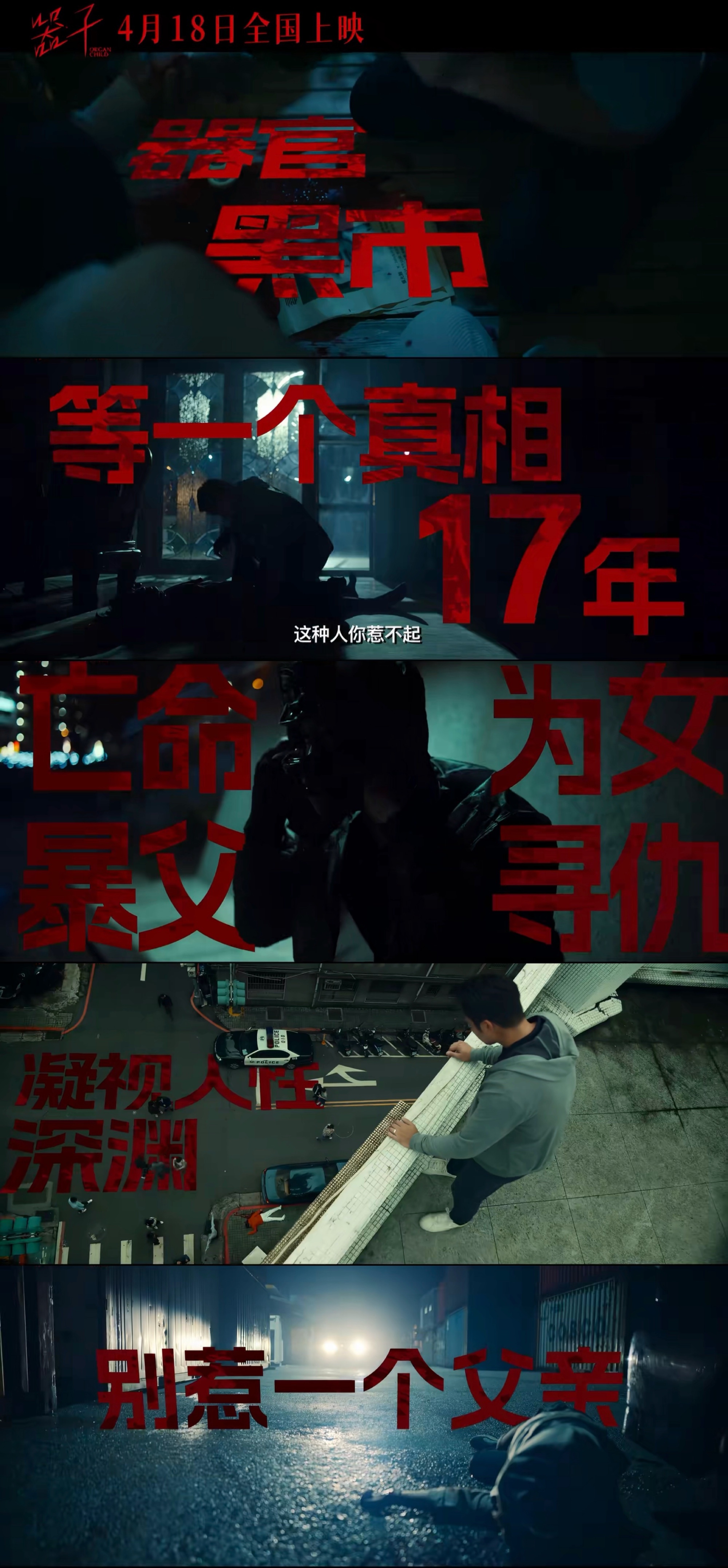 电影器子器子定档418 本月还有一部非常值得期待的新片《器子》!不是一般的犯罪片,而是涉及活体器官买卖、人口贩卖、暗网交易、官商勾结、私刑复仇的大尺度狠片!看预告非常生猛!“器子”的意思是活体器官的提供者,也是器官黑市被残酷交易的工具人,还未出生的婴儿体内的器官就已经明码标价,医院用其敛财,富人权贵视其为货源,整个罪恶产业链触目惊心,让人后脊发凉!《周处除三害》之后一直期待能再看到中国台湾的犯罪片出现在银幕上,《器子》除了剧情大胆,男神张孝全也贡献了非常炸裂的演技,女儿失踪,妻子自杀,自己蒙冤入狱,出狱后一边追寻真相,一边暴走复仇,从好父亲、好丈夫,化身以命相搏的嗜血杀神,前后反差感拉满!更有钉枪电椅水箱一系列酷刑折磨,刀刀见血,拳拳到肉,以暴制暴,完全杀红了眼,大银幕上看一定非常带感!坐等4月18日全国上映!必看!
