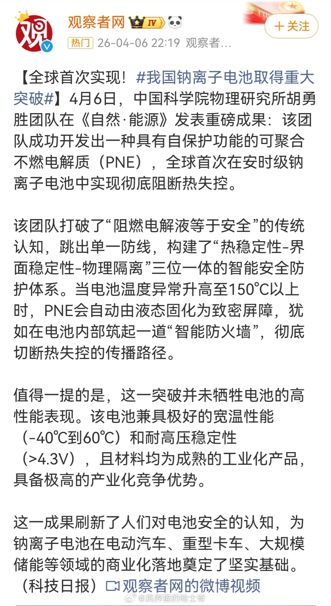 🔋钠离子电池重大突破!中国科学家全球首创“自保护电池”,热失控彻底消失🌟